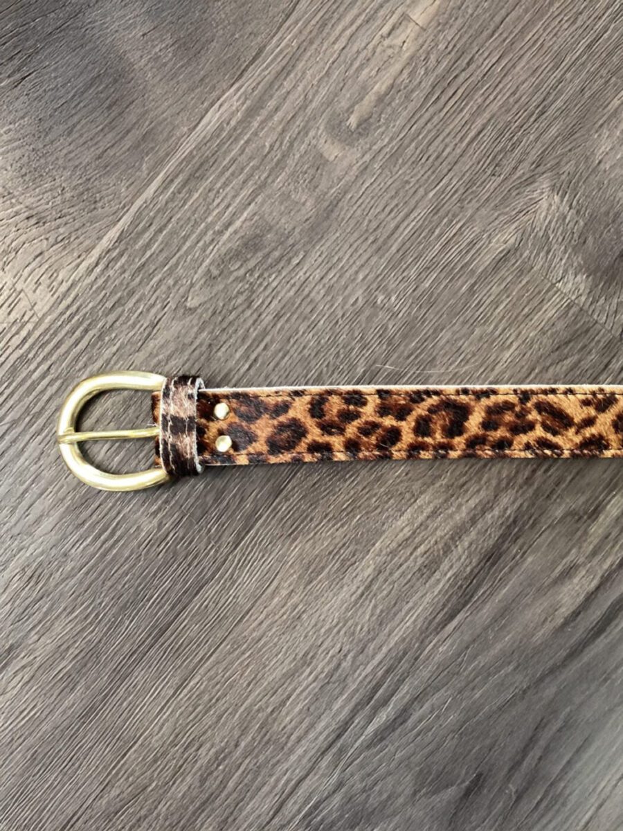 This is a gorgeous handmade Camel Leopard print leather belt with a gold buckle.
