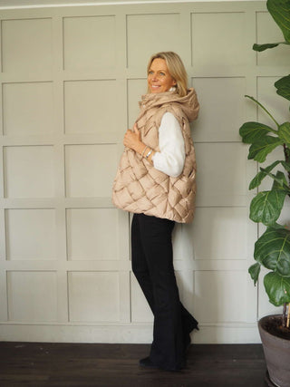 Gunner Woven Style Sleeveless Gilet with Hood, High Neck & Popper Fastening - Black, Camel