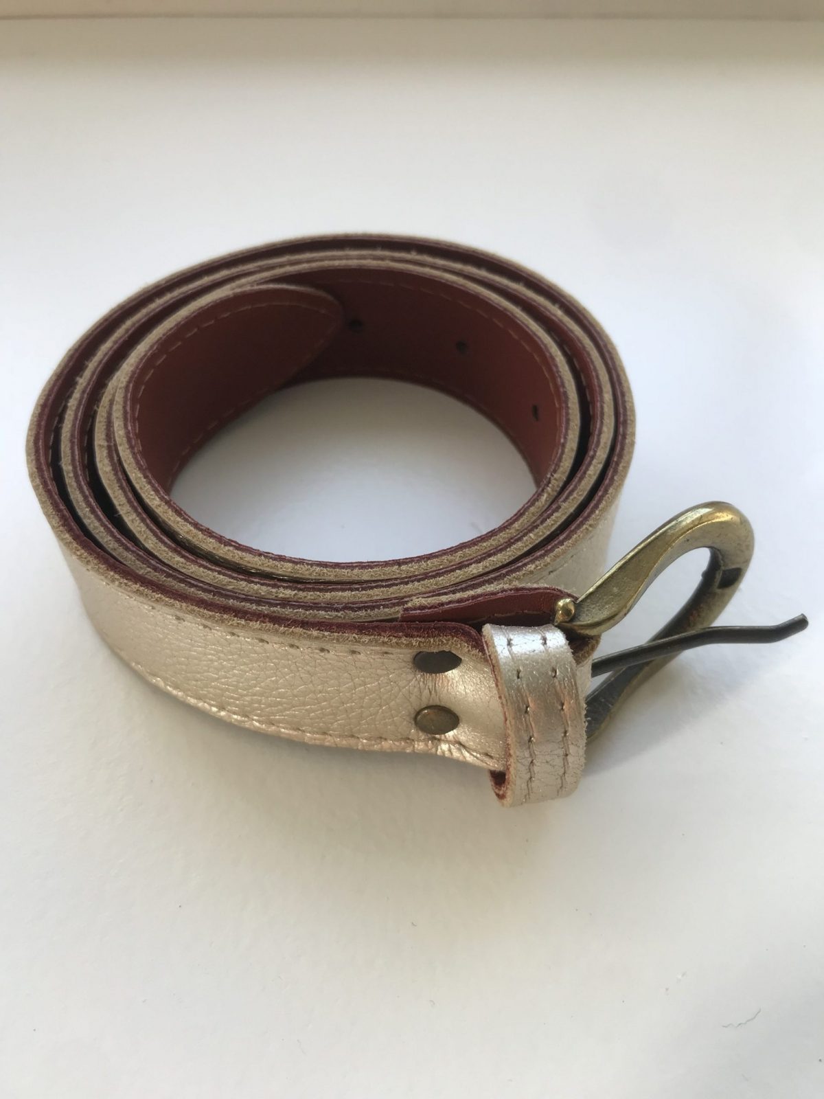 This is a gorgeous accessory! A leather belt with a gold buckle in Light Gold.