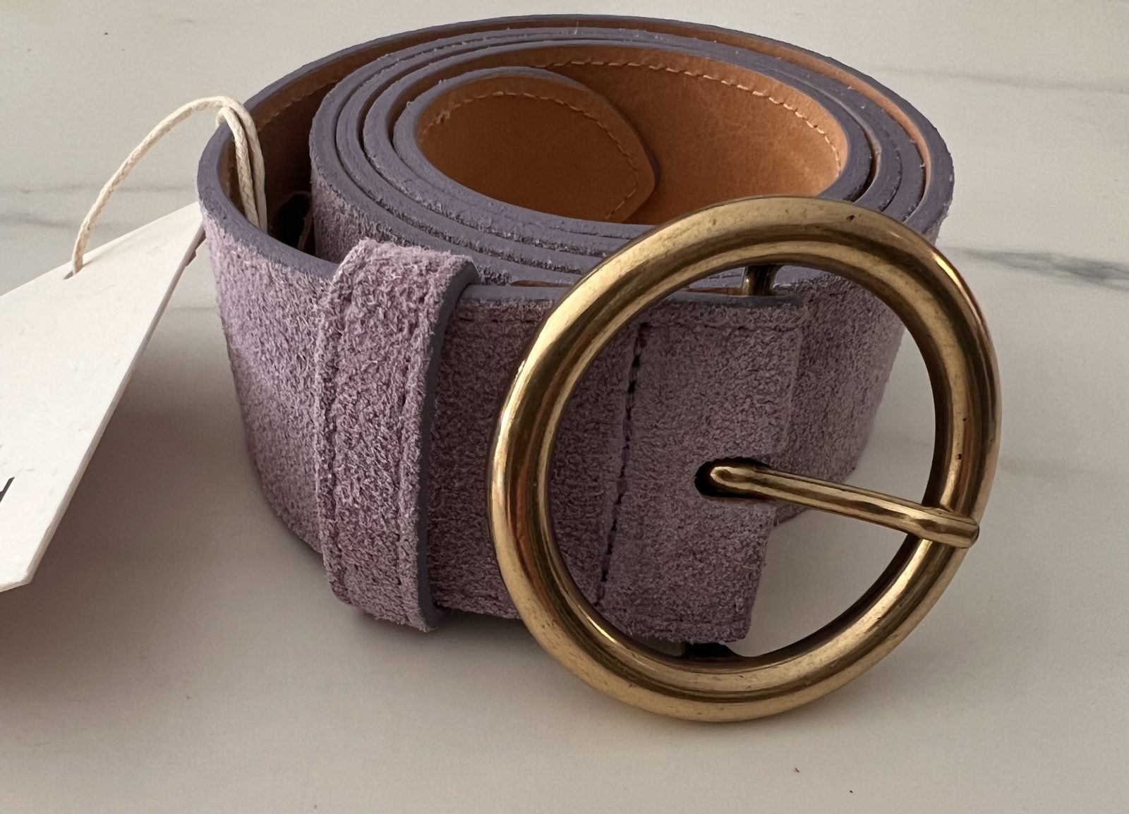 Gorgeous 100% suede leather belt with a round gold buckle.