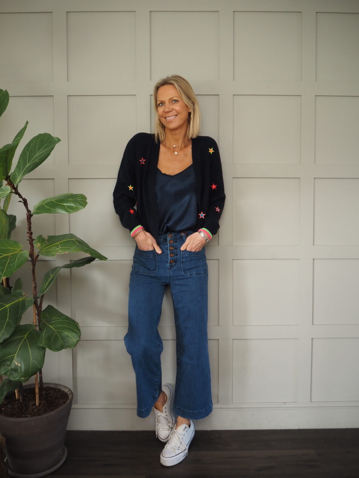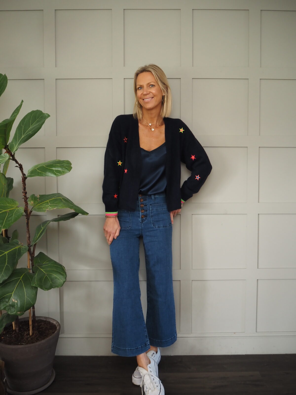Worn here with the Eva jeans in mid blue and the Handi camisole in navy blue.