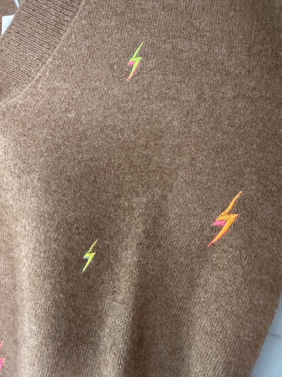 Stunning 100% cashmere knit by Brodie. It is v necked and features embroidered lightening bolts in neon all over.