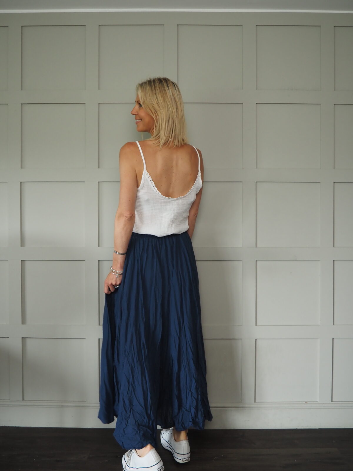 Sizing: S/M (8-10) and M/L (12-14). Becky is a size 10 and 5’9” tall and is wearing the S/M.