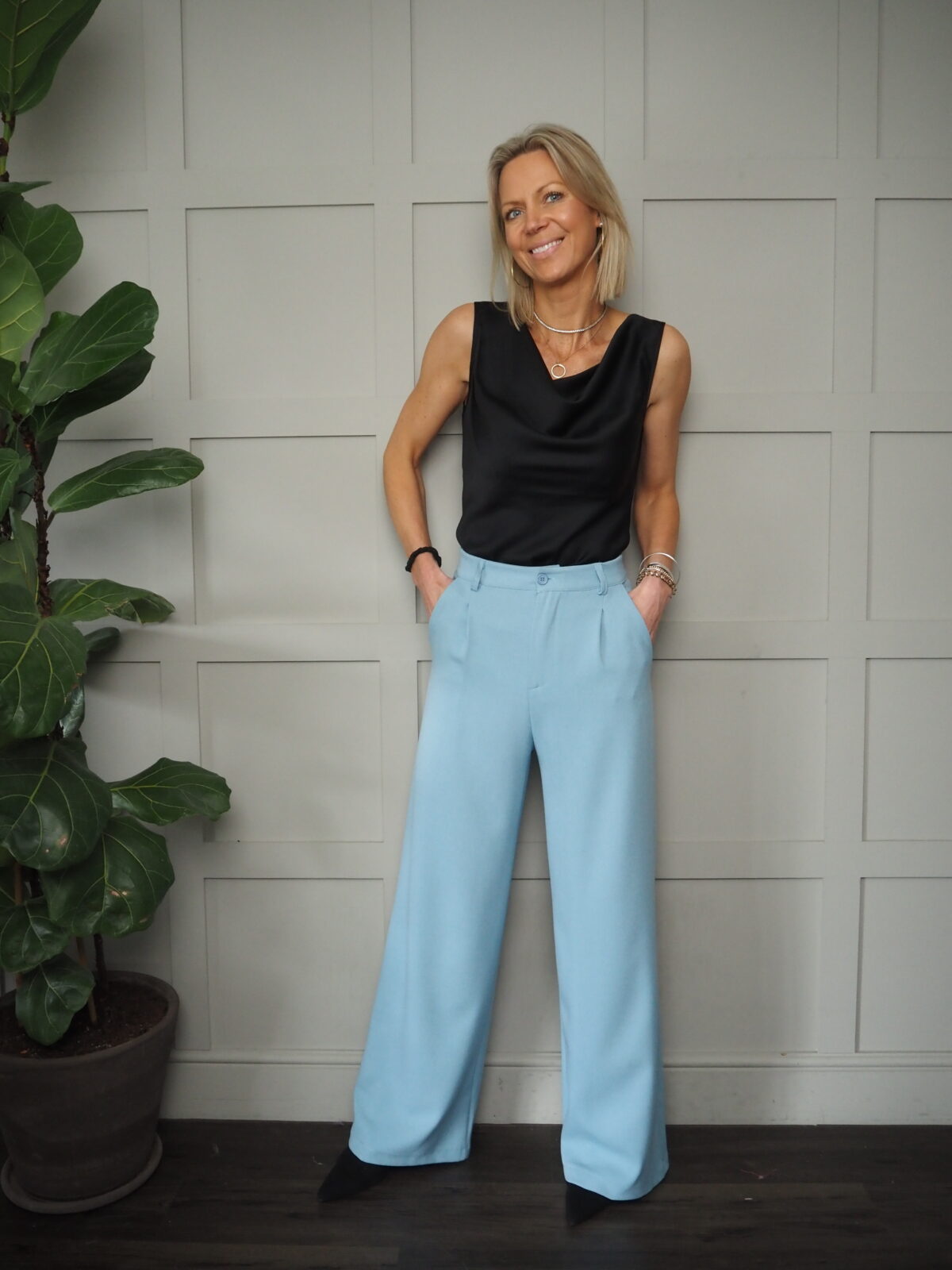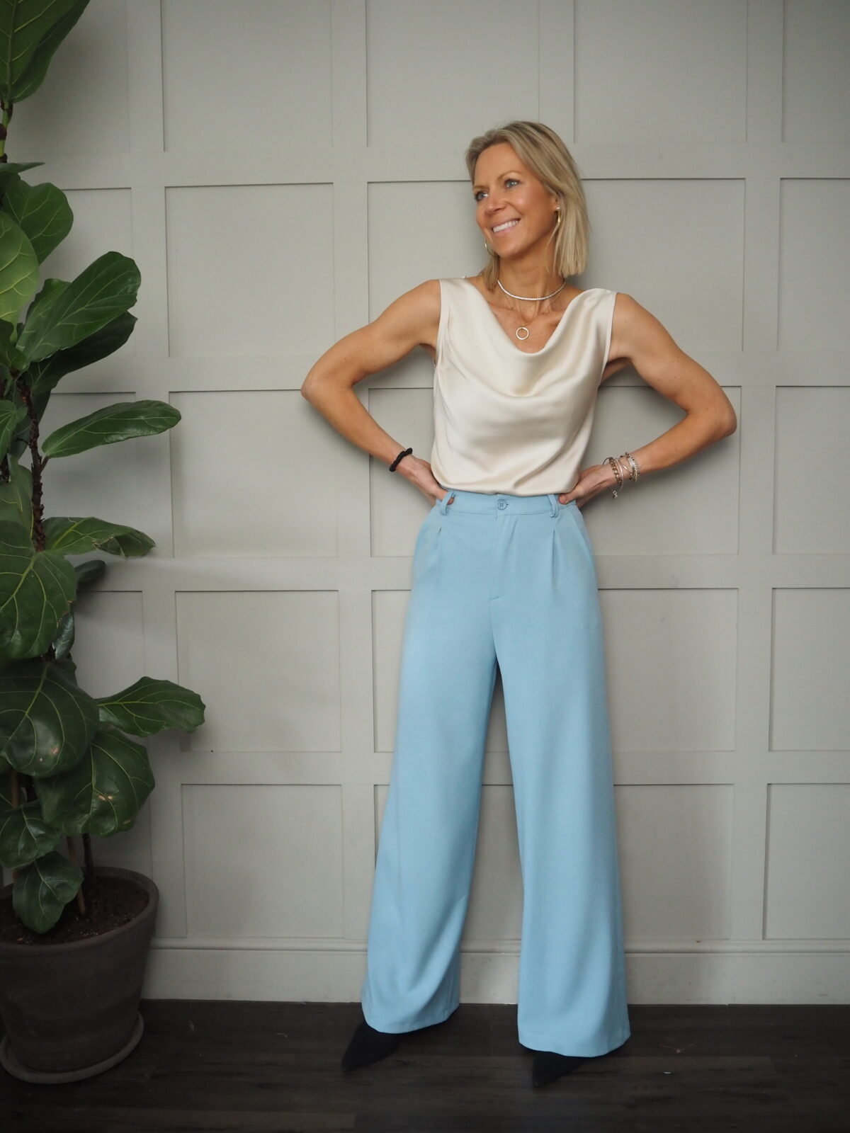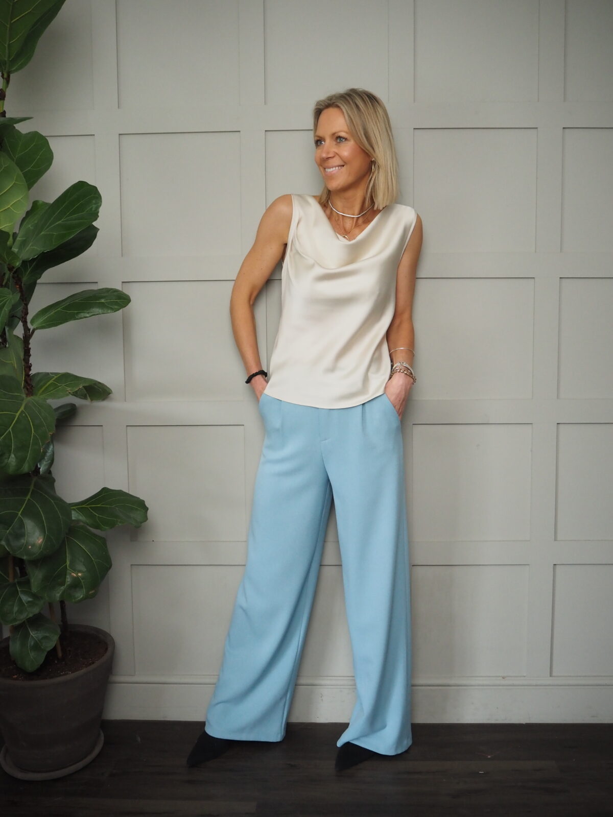 Simple and versatile, this silky cowl neck top has a fabulous V back.