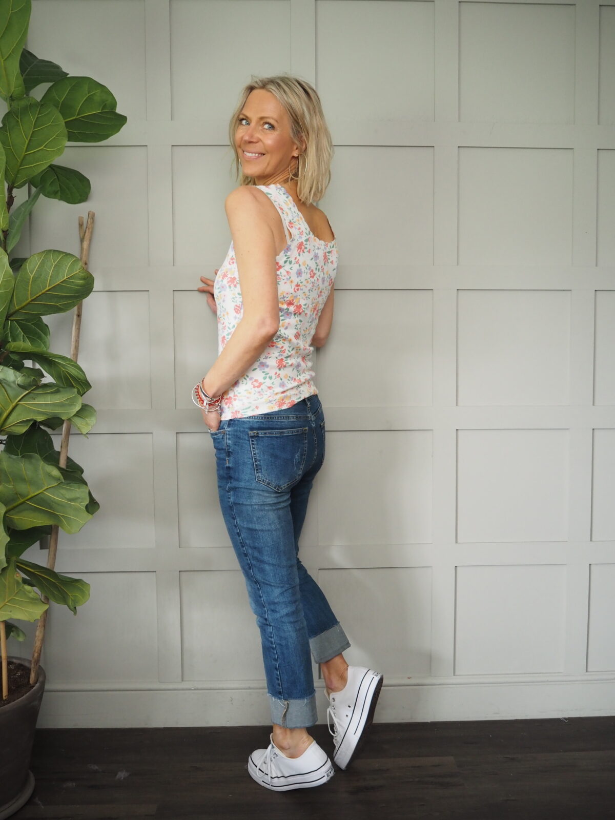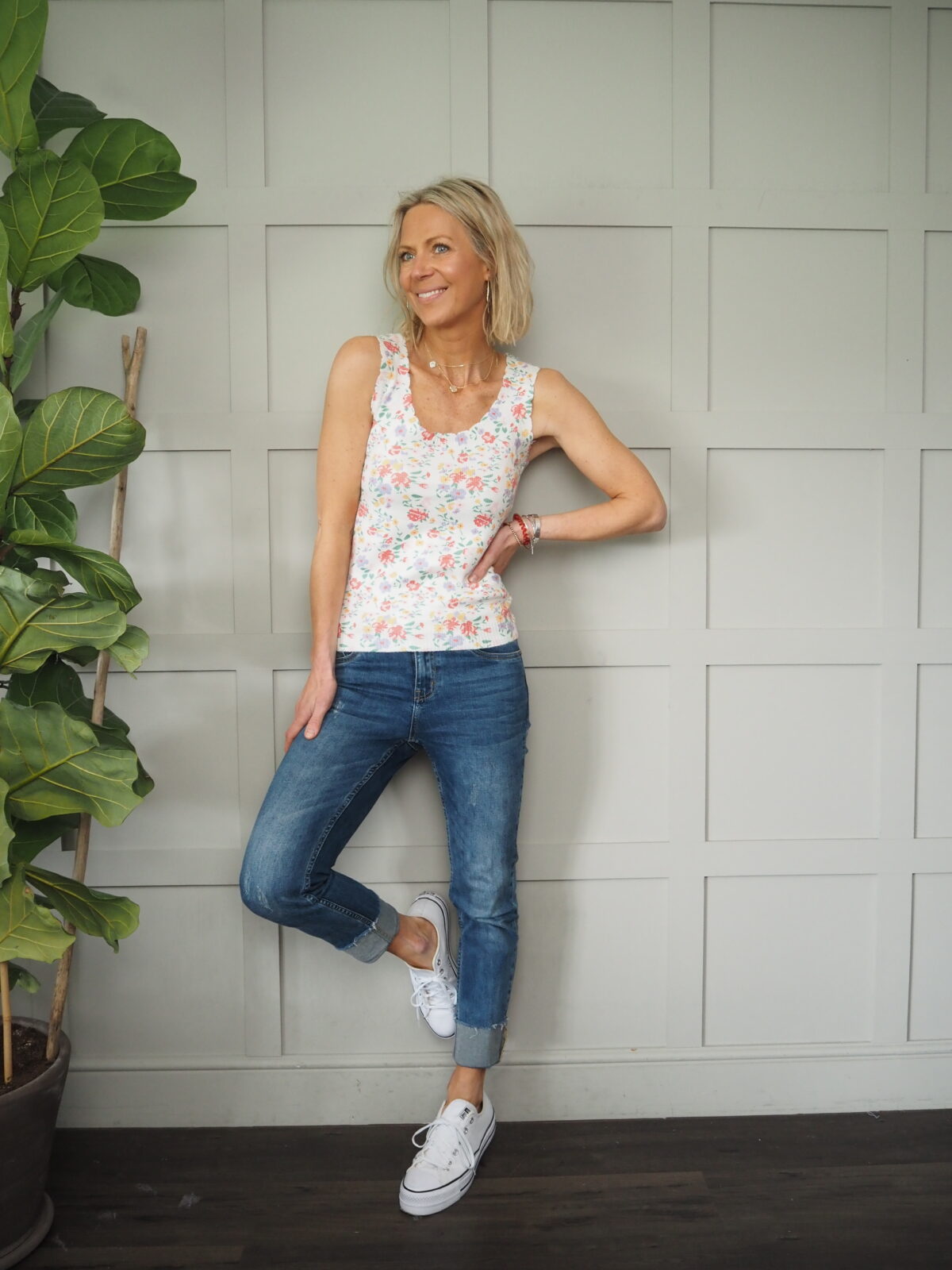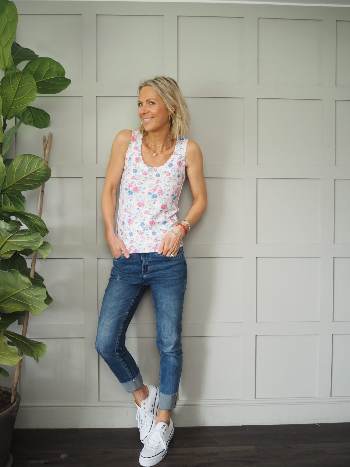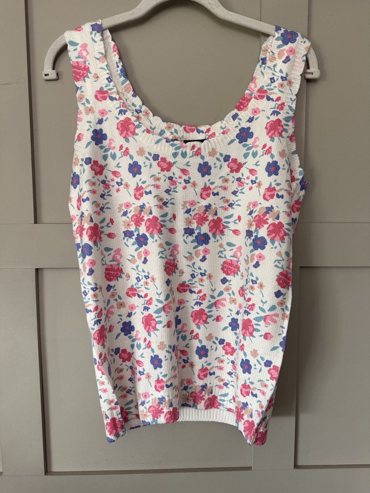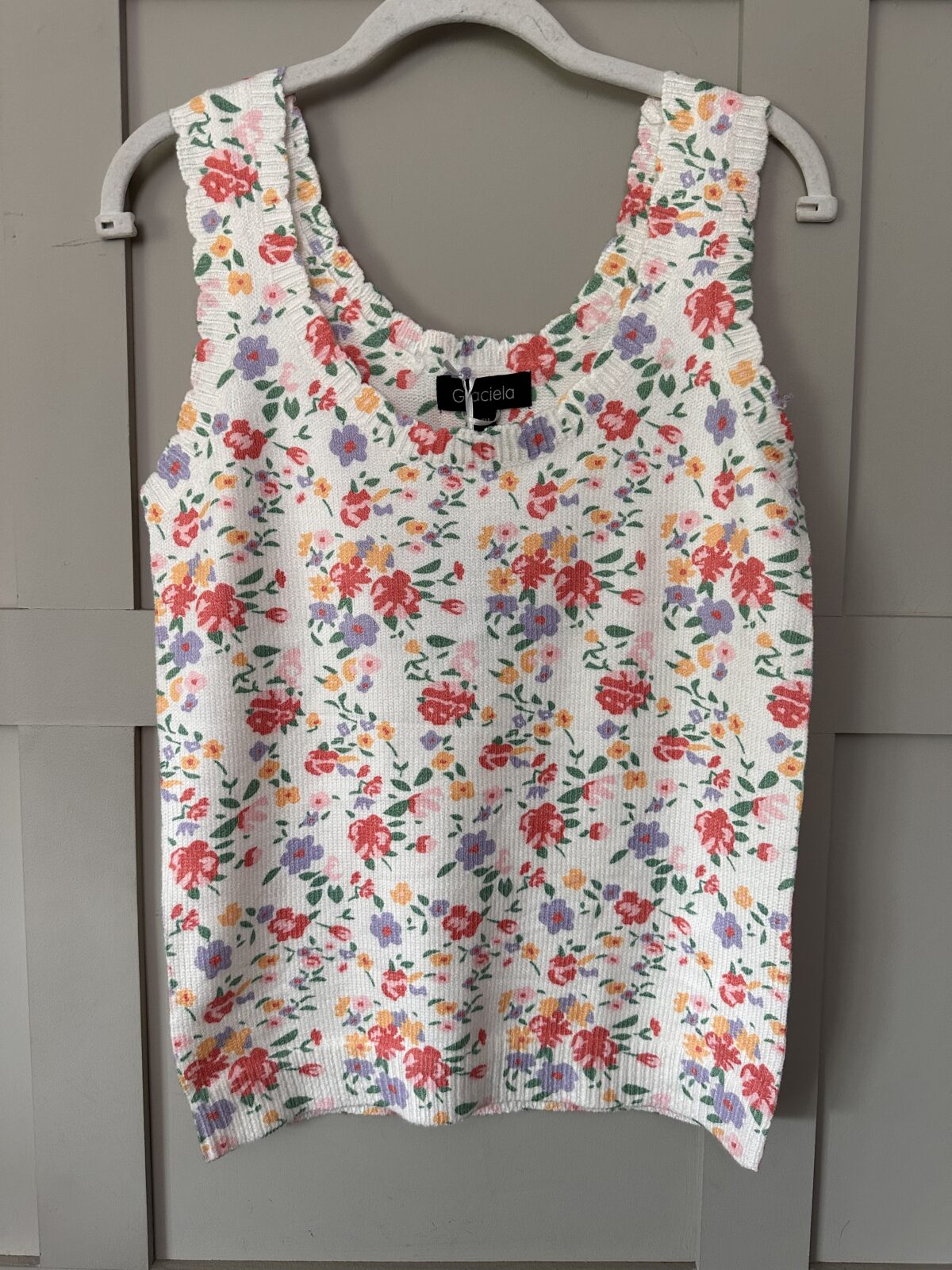 Soft and super tactile, this vest has an all over floral design in multi colours. Subtle ribbing and scalloped edges.
