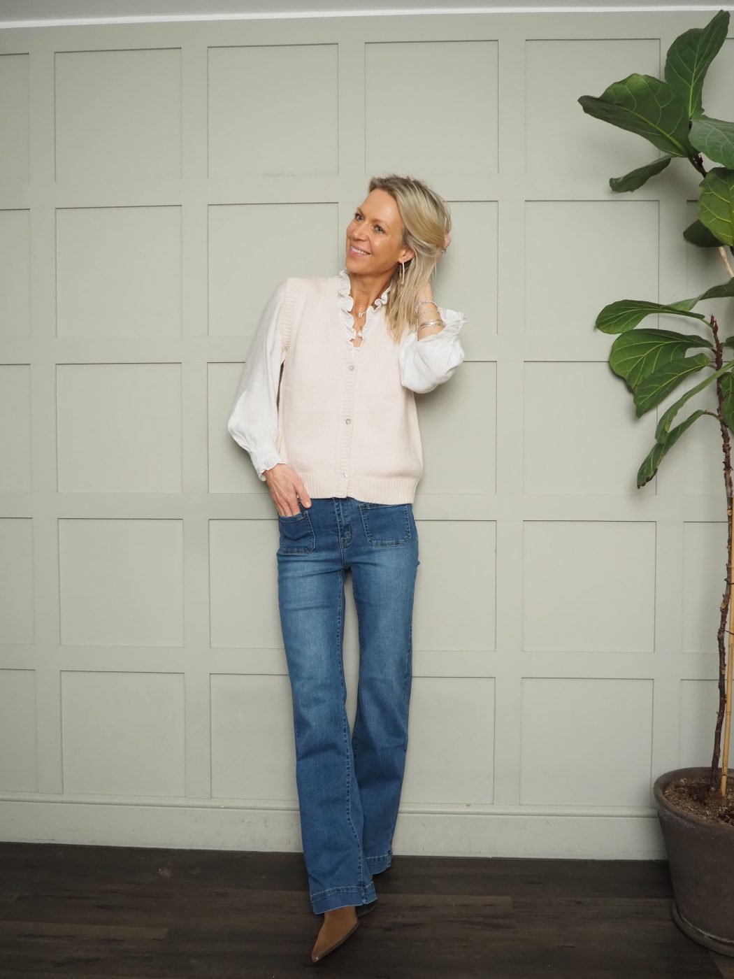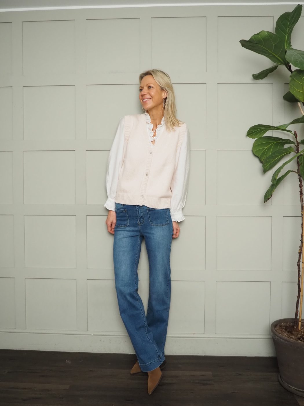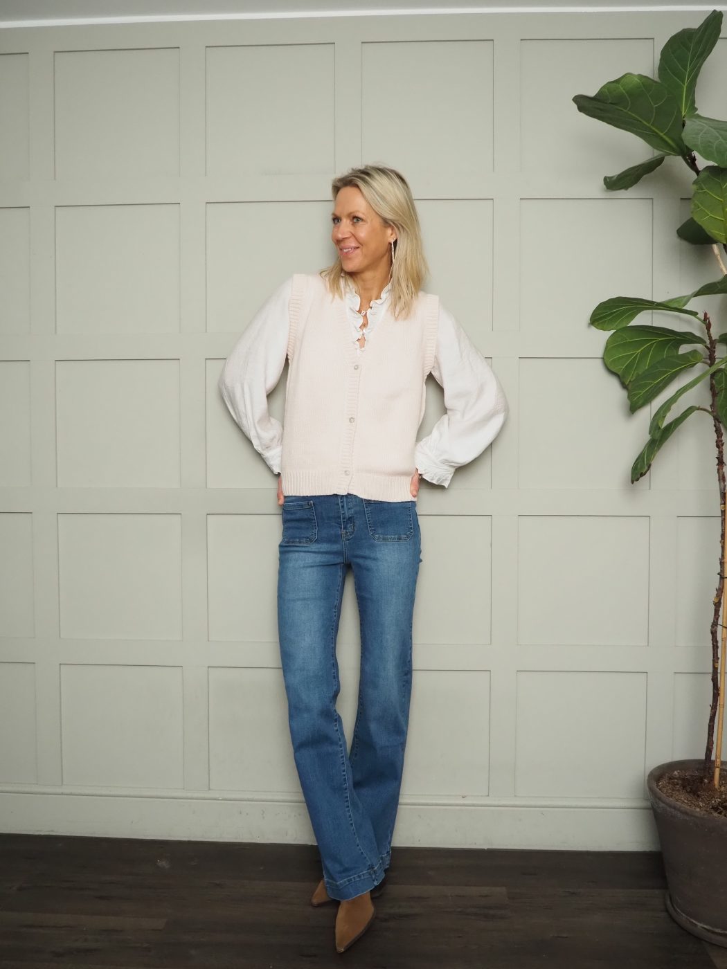 Worn here with: Violetta Boot Cut, Mid Rise Jeans with Square Front Pockets – Black, Dark Indigo, Denim Blue, Grey, Khaki and the Elcot Long Sleeve Blouse with V Neckline and Frill Detail – Baby Blue, Black, Burgundy, Navy and Off White