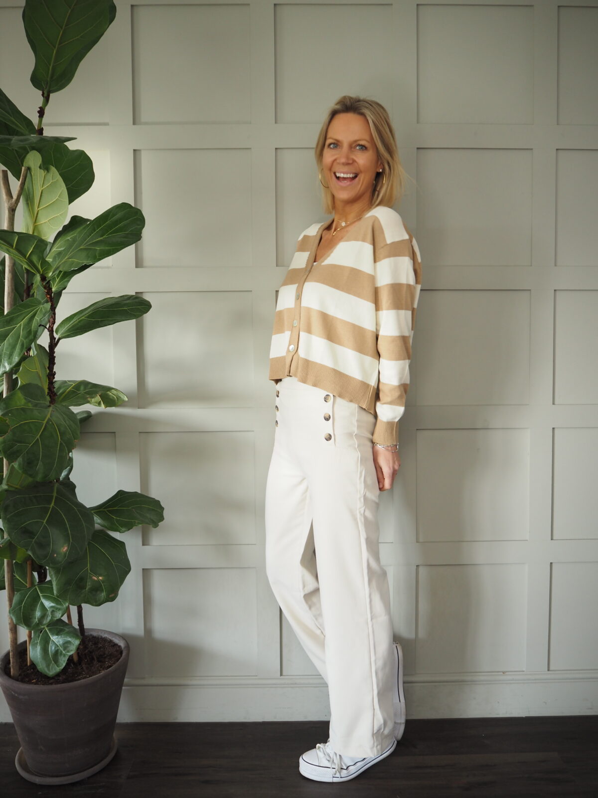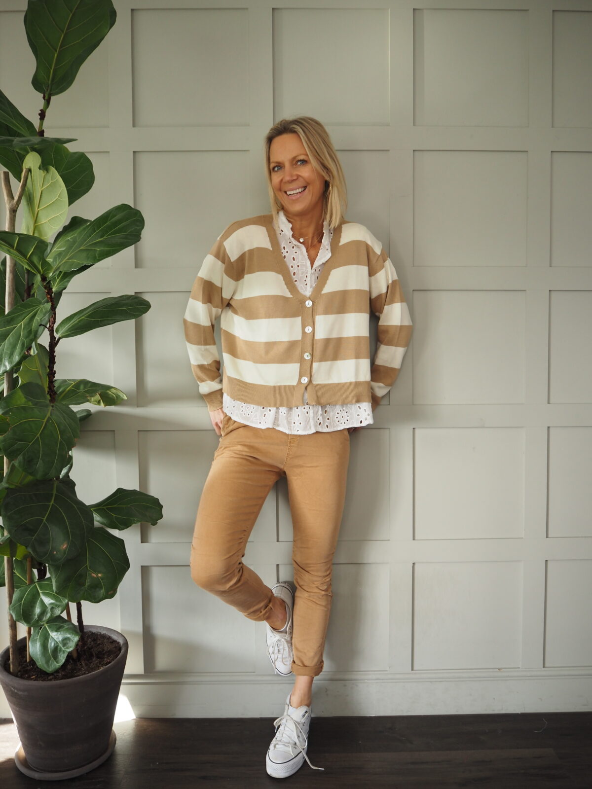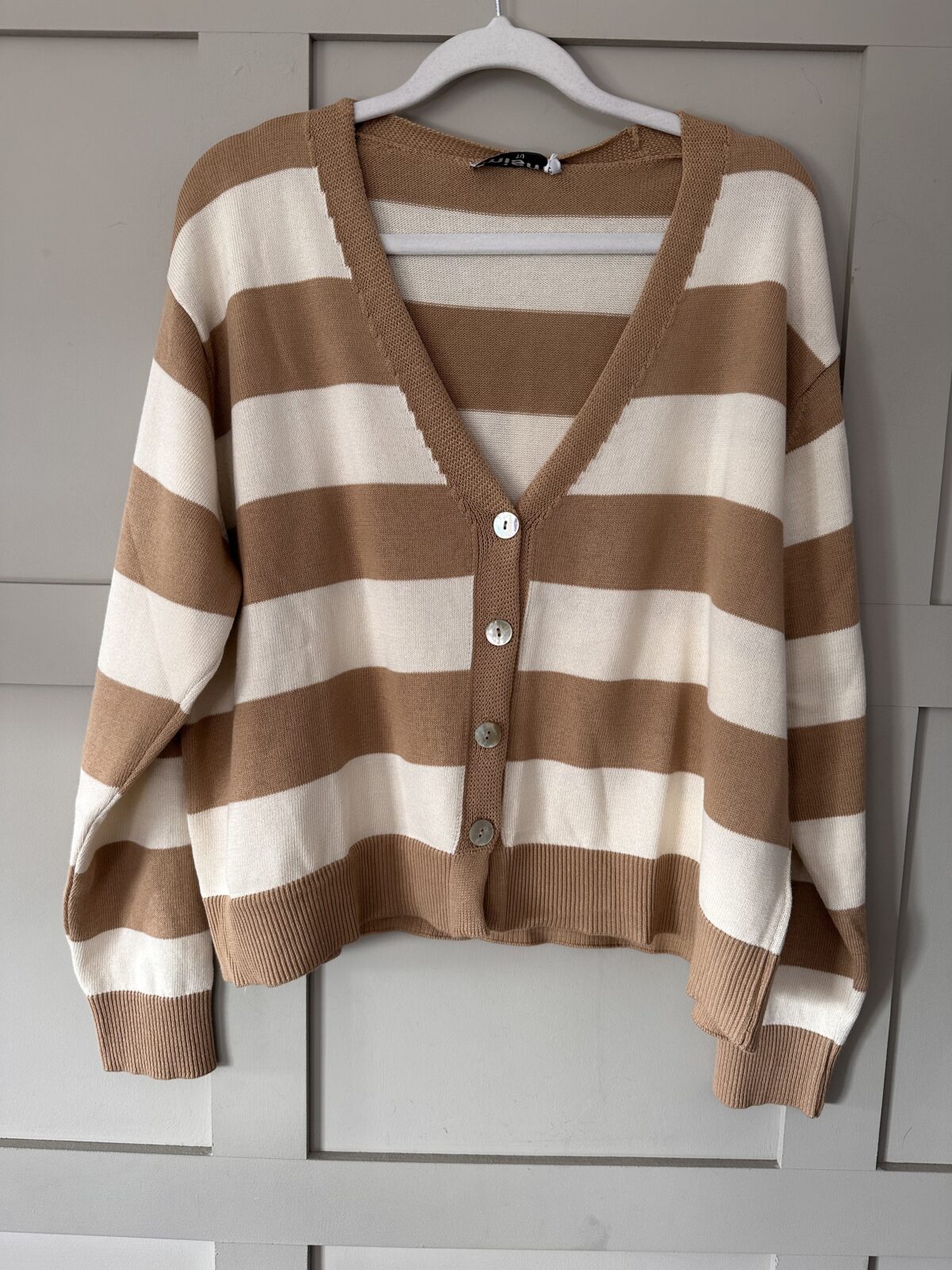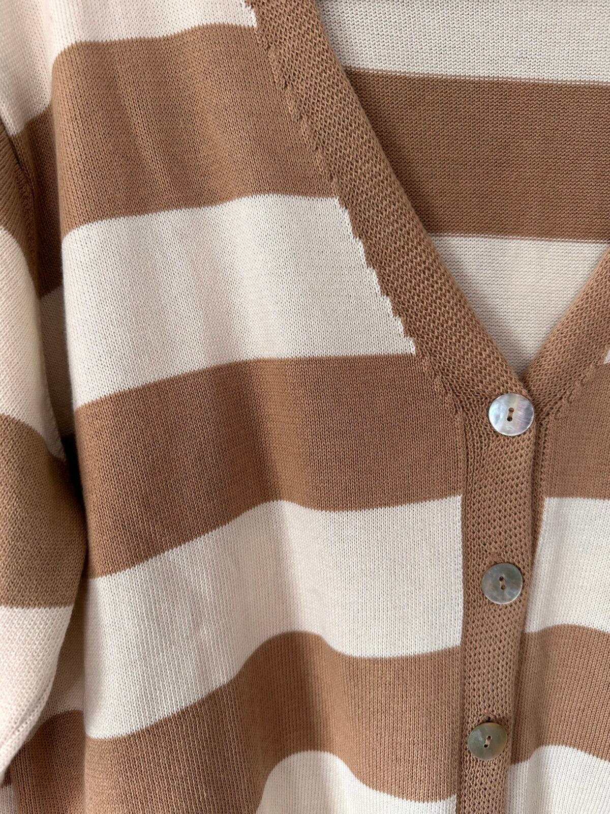 Simi Striped Cardigan with Button Fastenings - Camel/Off White