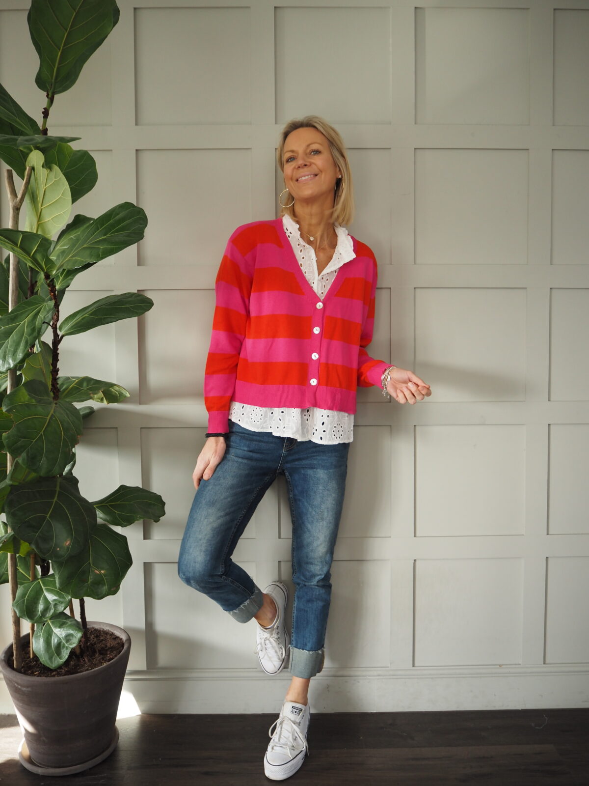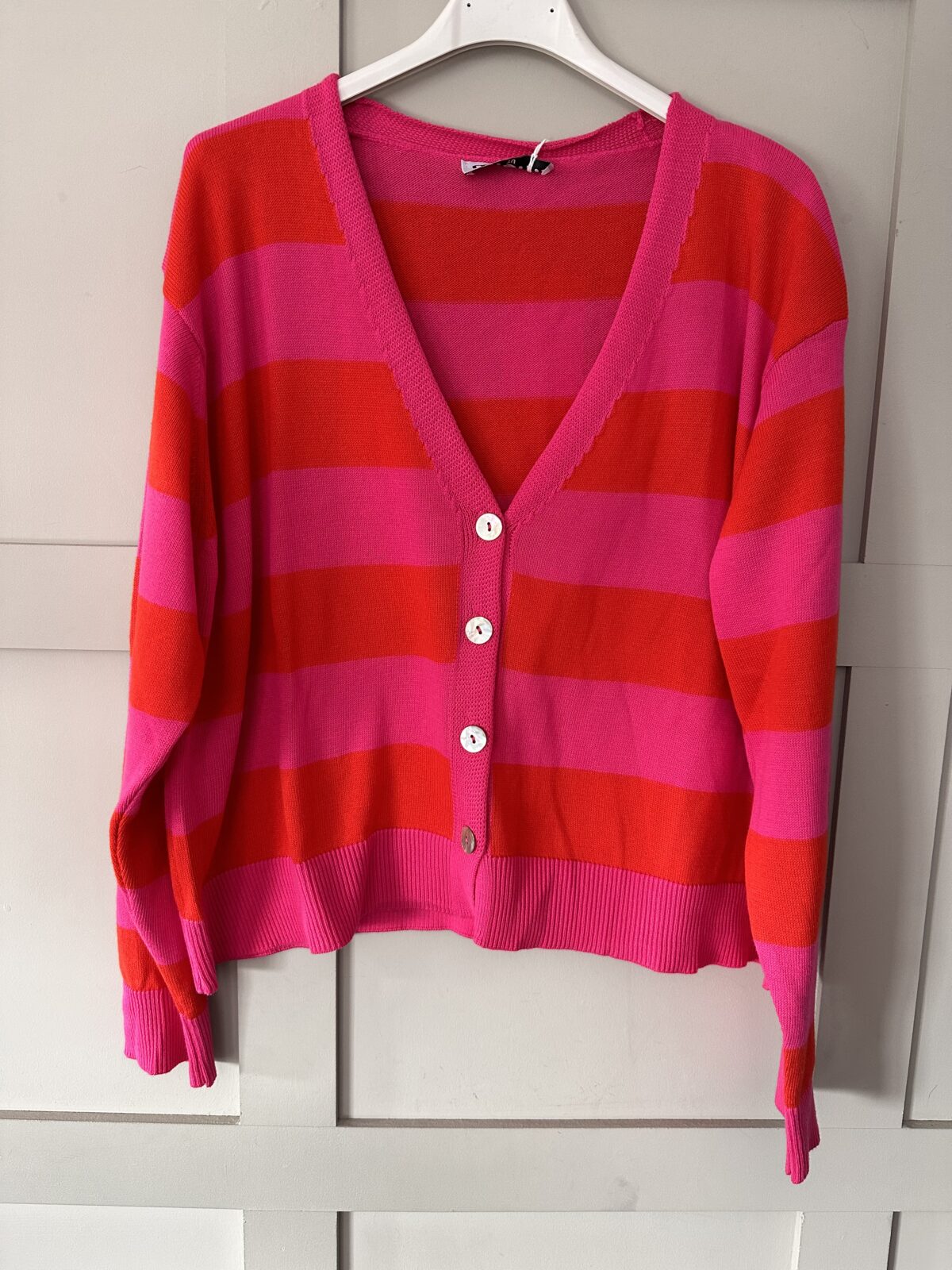 This sweet, striped cardigan with pretty mother of pearl style buttons is a boxy shape and shorter in length which works brilliantly with skirts and looks great layered over dresses. Also works worn layered over blouses and worn with jeans or trousers.