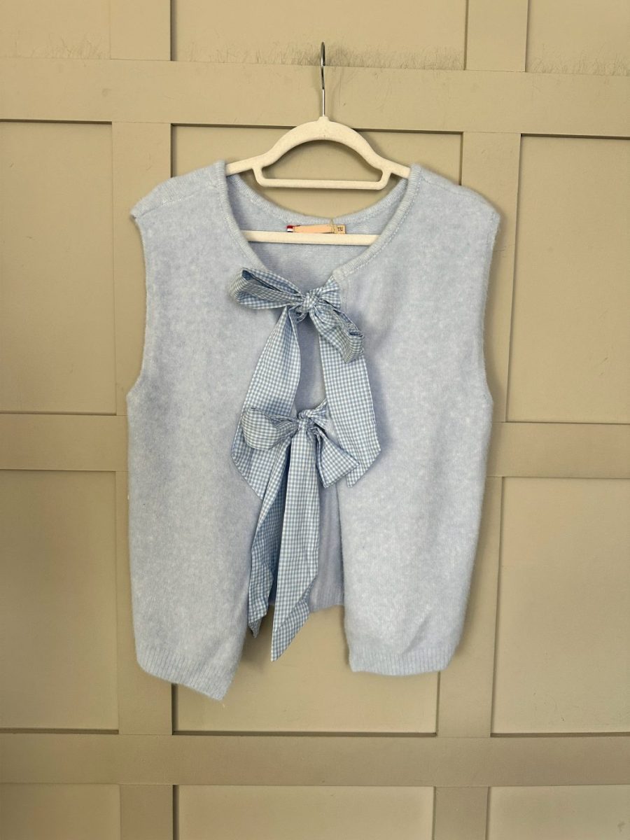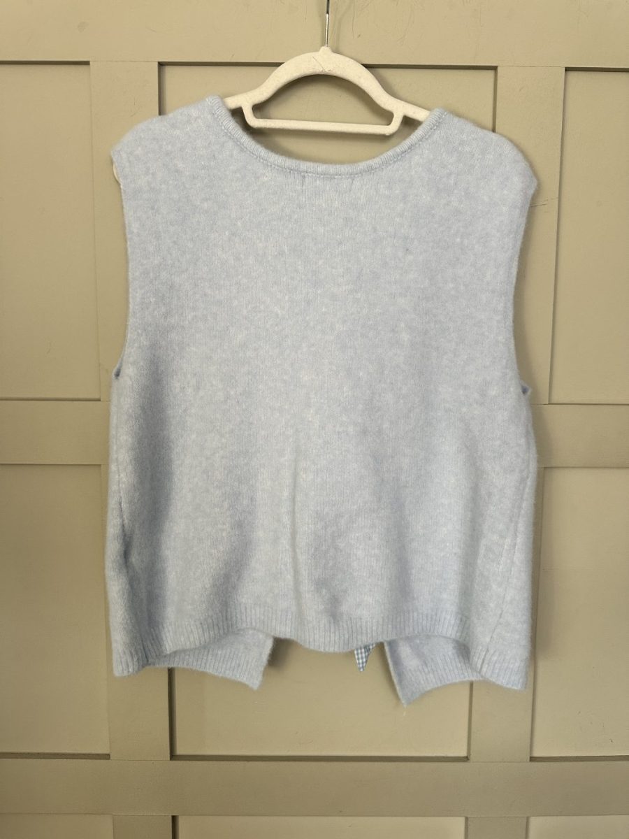 This super soft, incredibly pretty sleeveless cardigan has two gingham ties at the front to fasten it. The ties can be adjusted to suit different sizes.