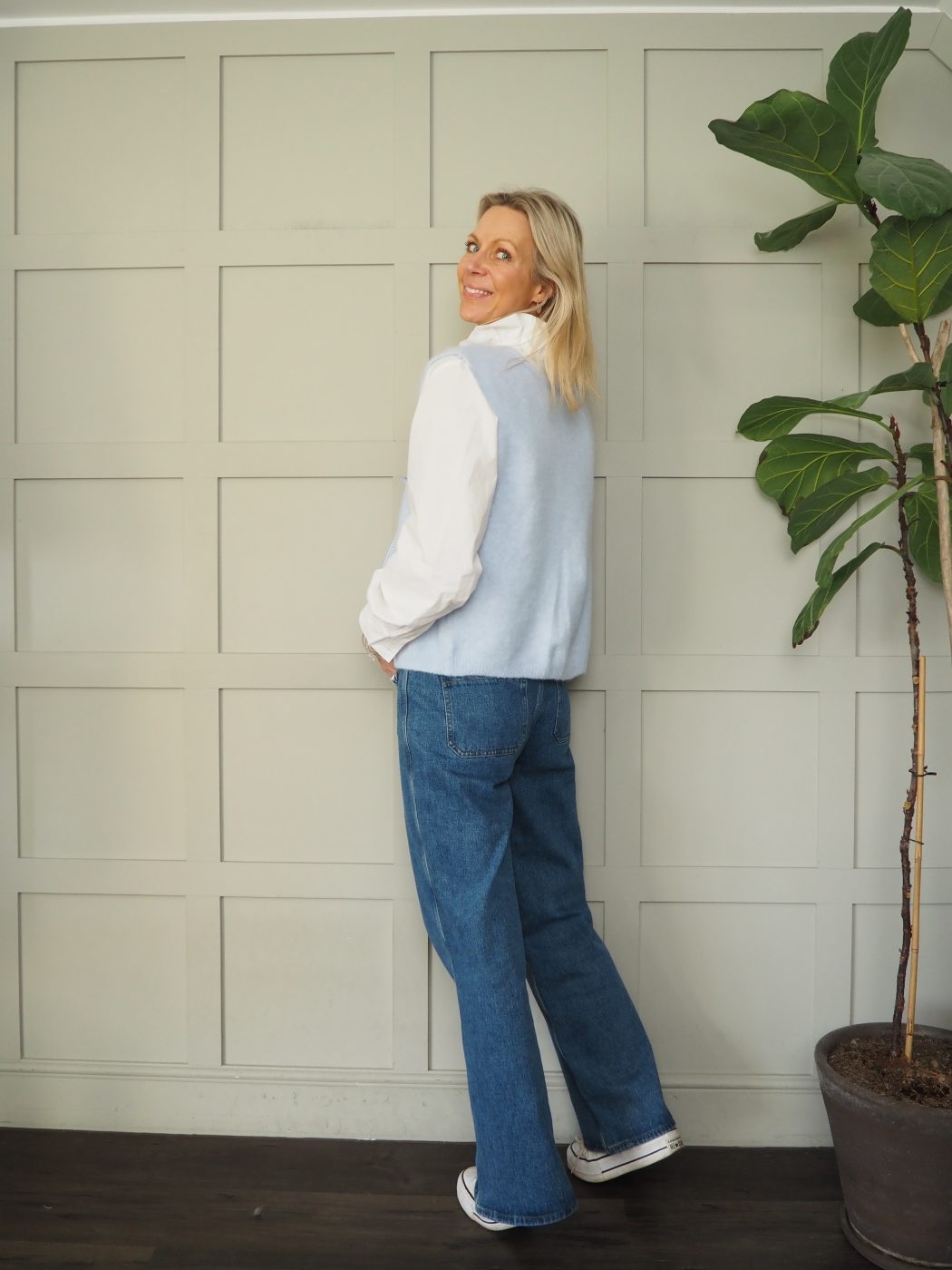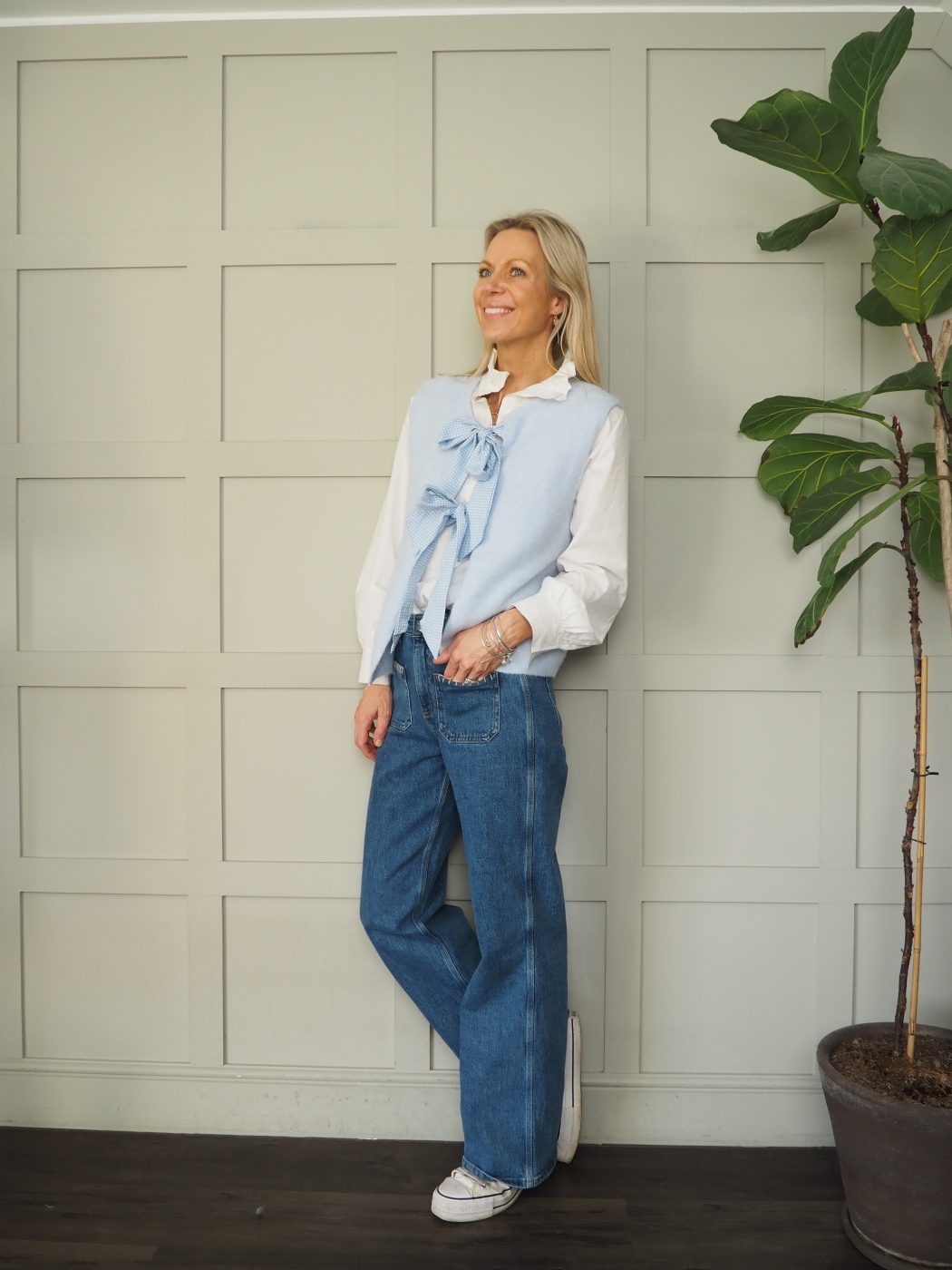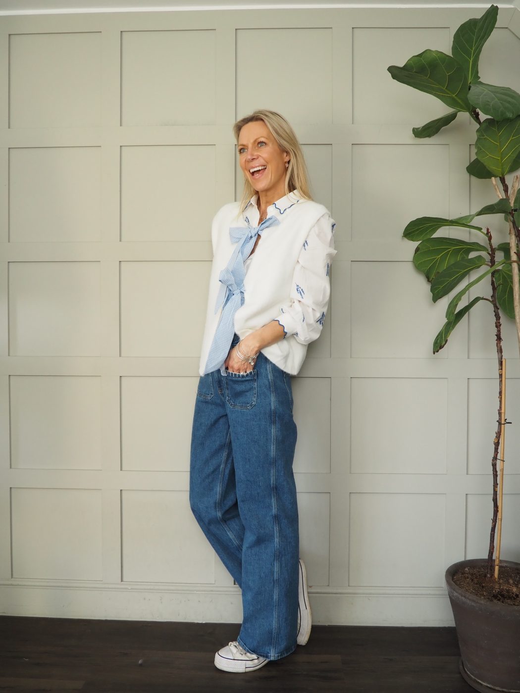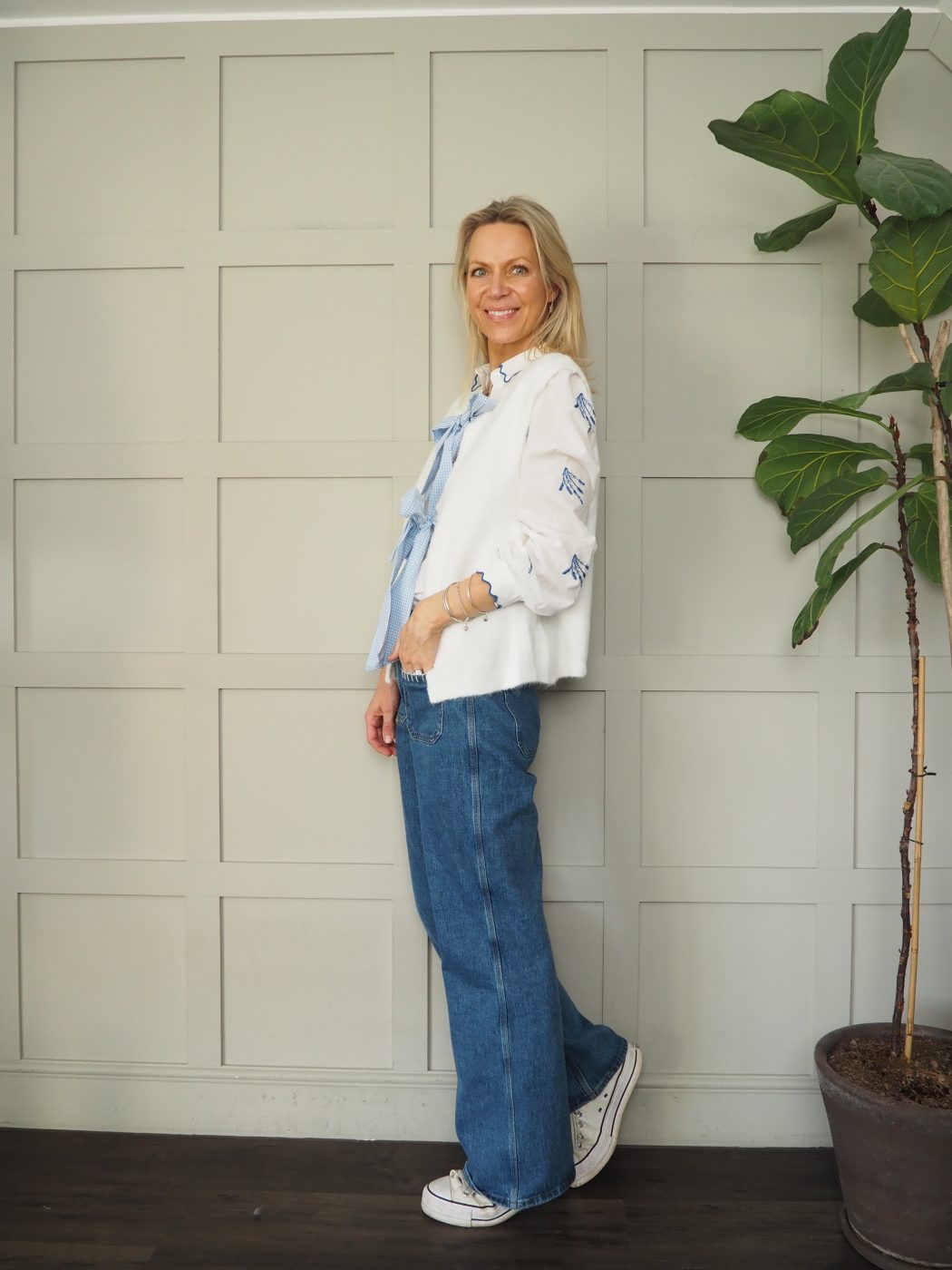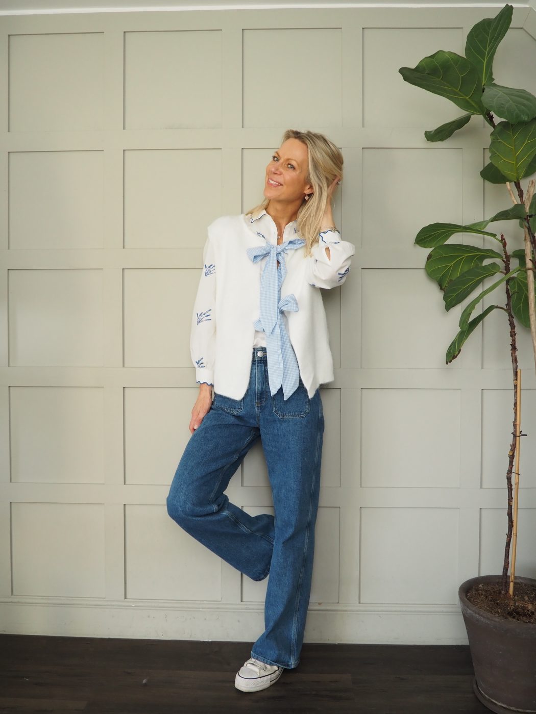 Worn with: the Mabel Patched Pocket Wide Leg Jeans by Seventy Mochi – Dark Vintage and Vintage Americana And the Potter High Neck Long Sleeve Blouse – Blue Stripe, Off White and the Lorde Long Sleeve Blouse with Scalloped Collar & Floral Embroidery – Off White/Royal Blue