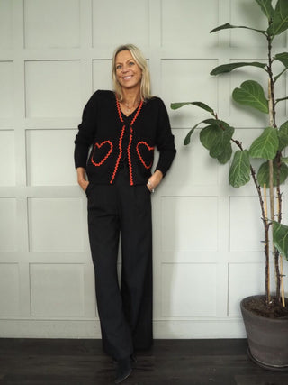 Fea Soft Cardigan with Tie Fastening & Red Ric-Rac Hearts and Trim - Black