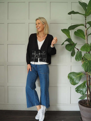 Lita Linen Cardigan with Front Tie Fastening & Crochet Detail - Black, Navy Blue and White