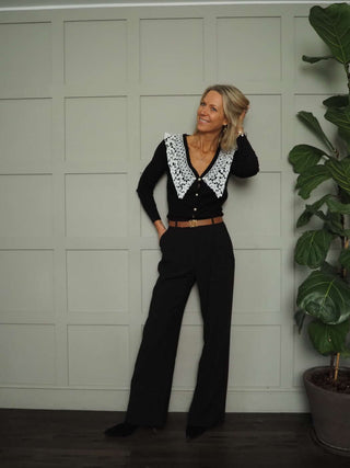 Remal Fine Rib Cardigan with White Lace Collar and Button Fastenings - Black