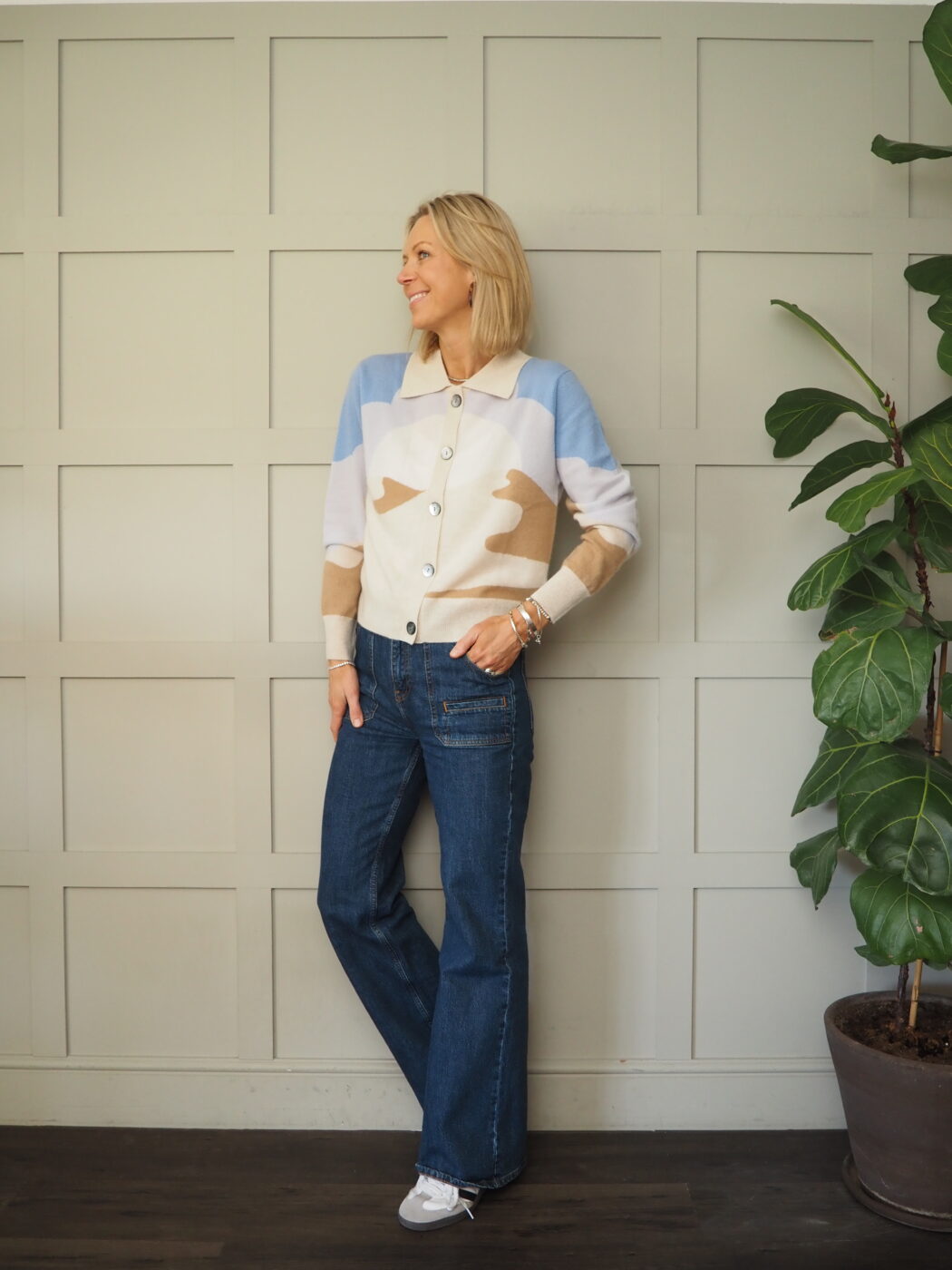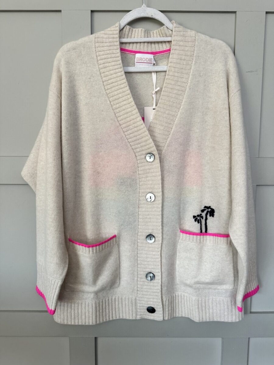 This is a luxurious cardi with a funky design – featuring a yellow cactus on the back and blue, oatmeal and camel colours. 5 button fastening to the front and a collar.
