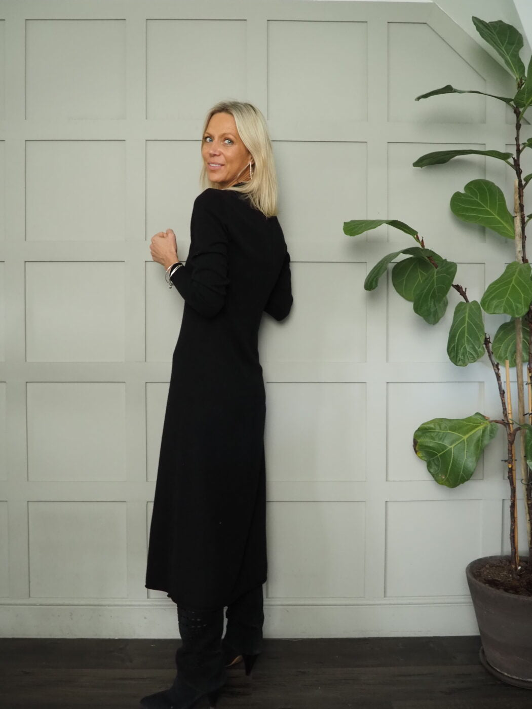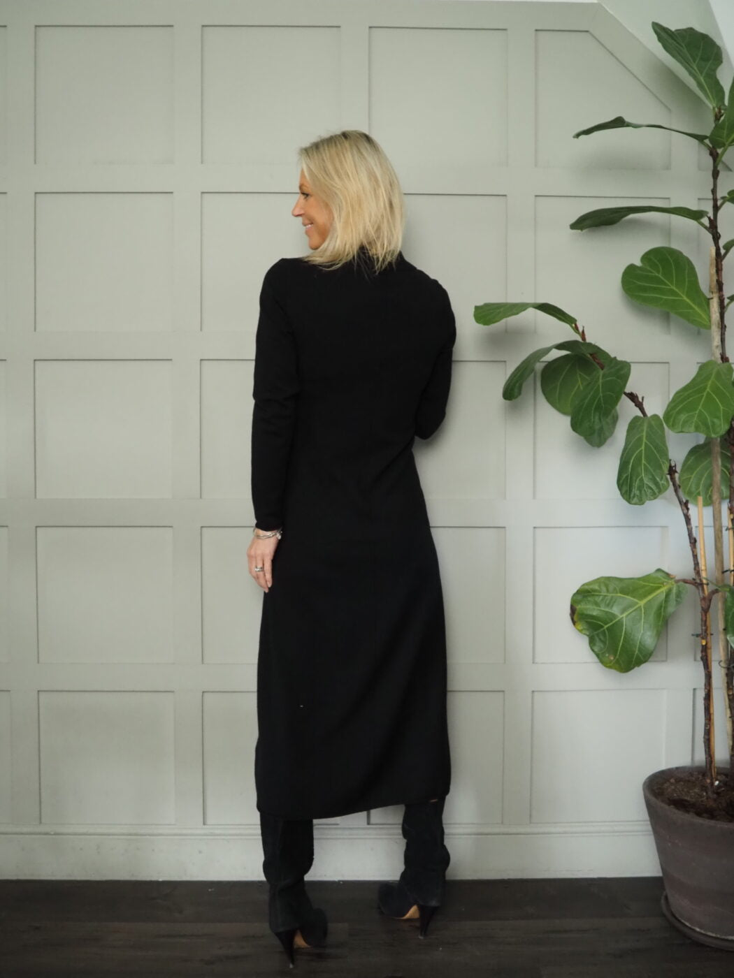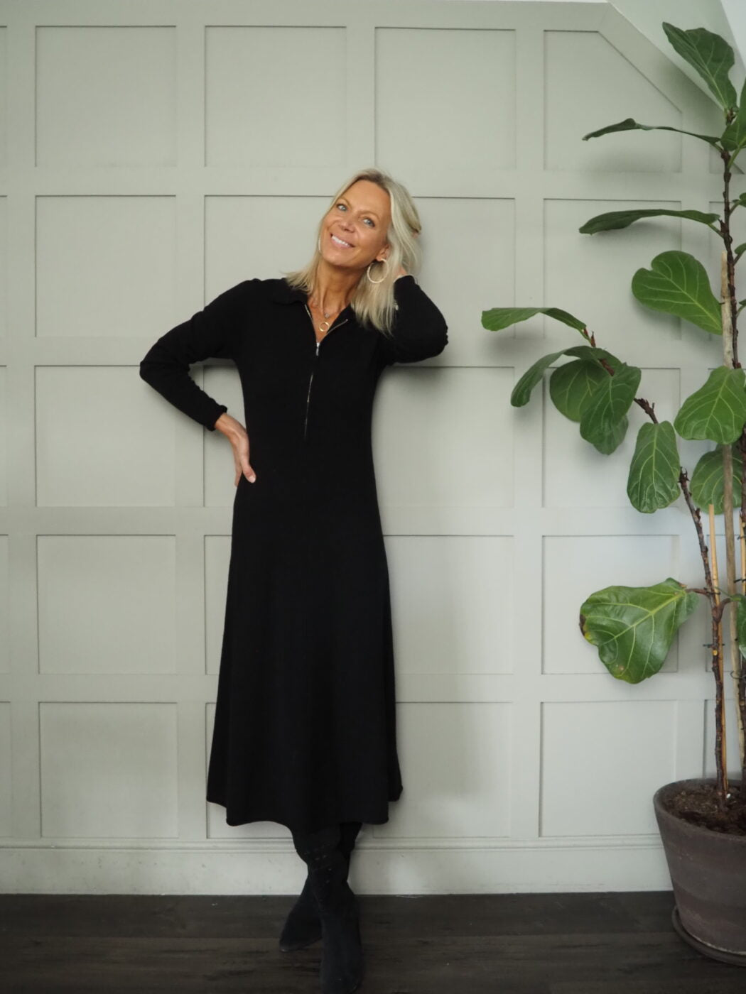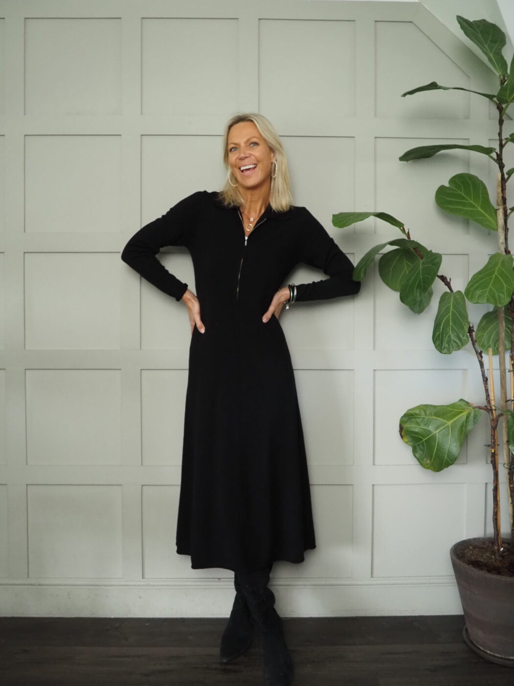 This cashmere blend dress is soft and very comfortable to wear with an extremely flattering silhouette. It has a collar, full length sleeves and a zip which gives it a modern twist. The zip can be worn unzipped or zipped down to give it a V neckline. A fabulous, very classic and elegant piece for the autumn and winter which can be worn casually or dressed up.