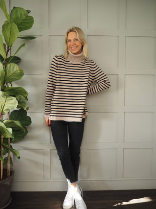 Becks Polo Neck Cashmere Mix Jumper - Oatmeal/Black Stripe