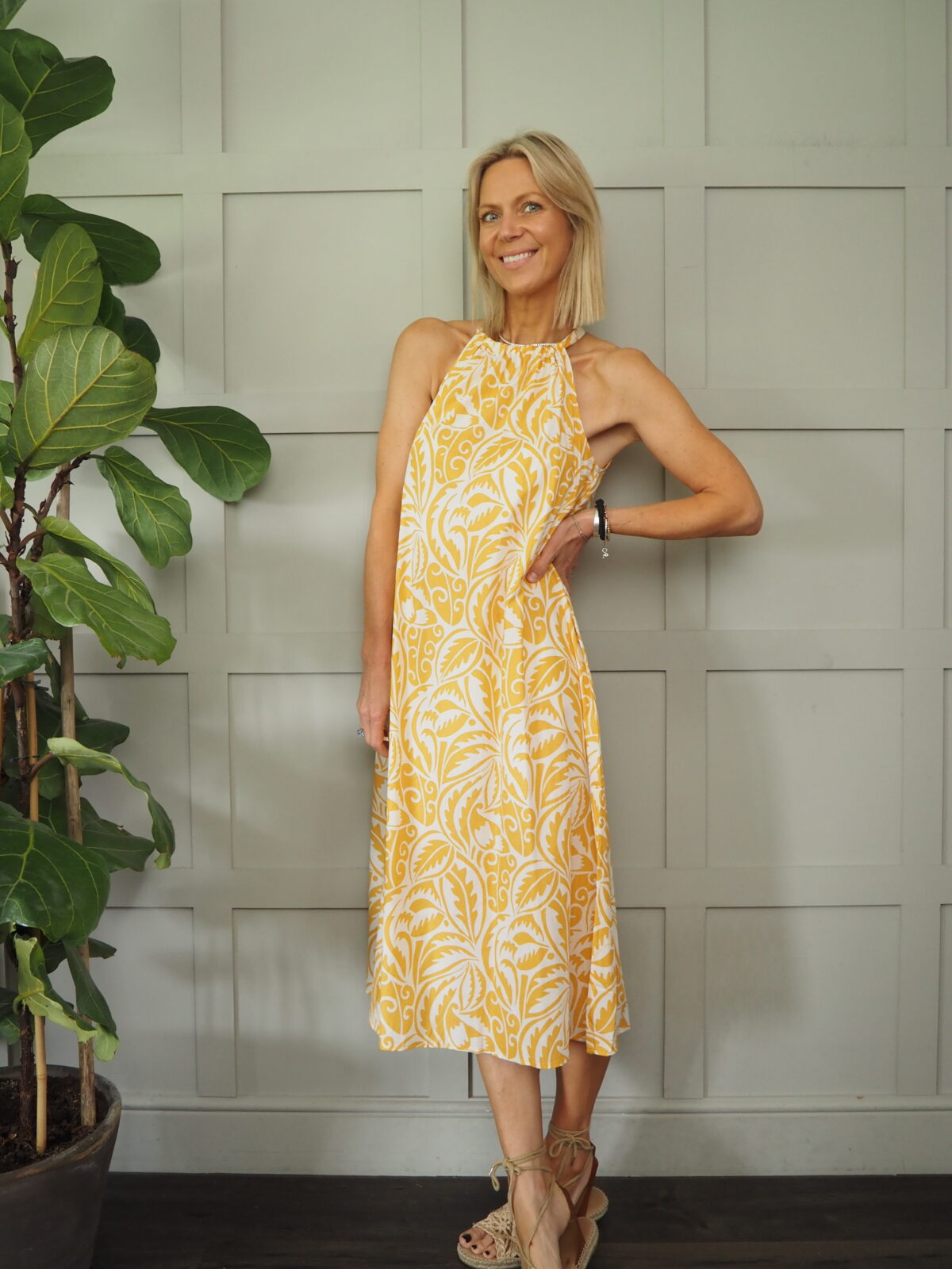 The Bungi dress is a stunner! Perfect for the beach – it is midi in length so will work on a variety of heights. Beautiful funky pattern, halter neck with a tie, slightly open backed – simply perfect!
