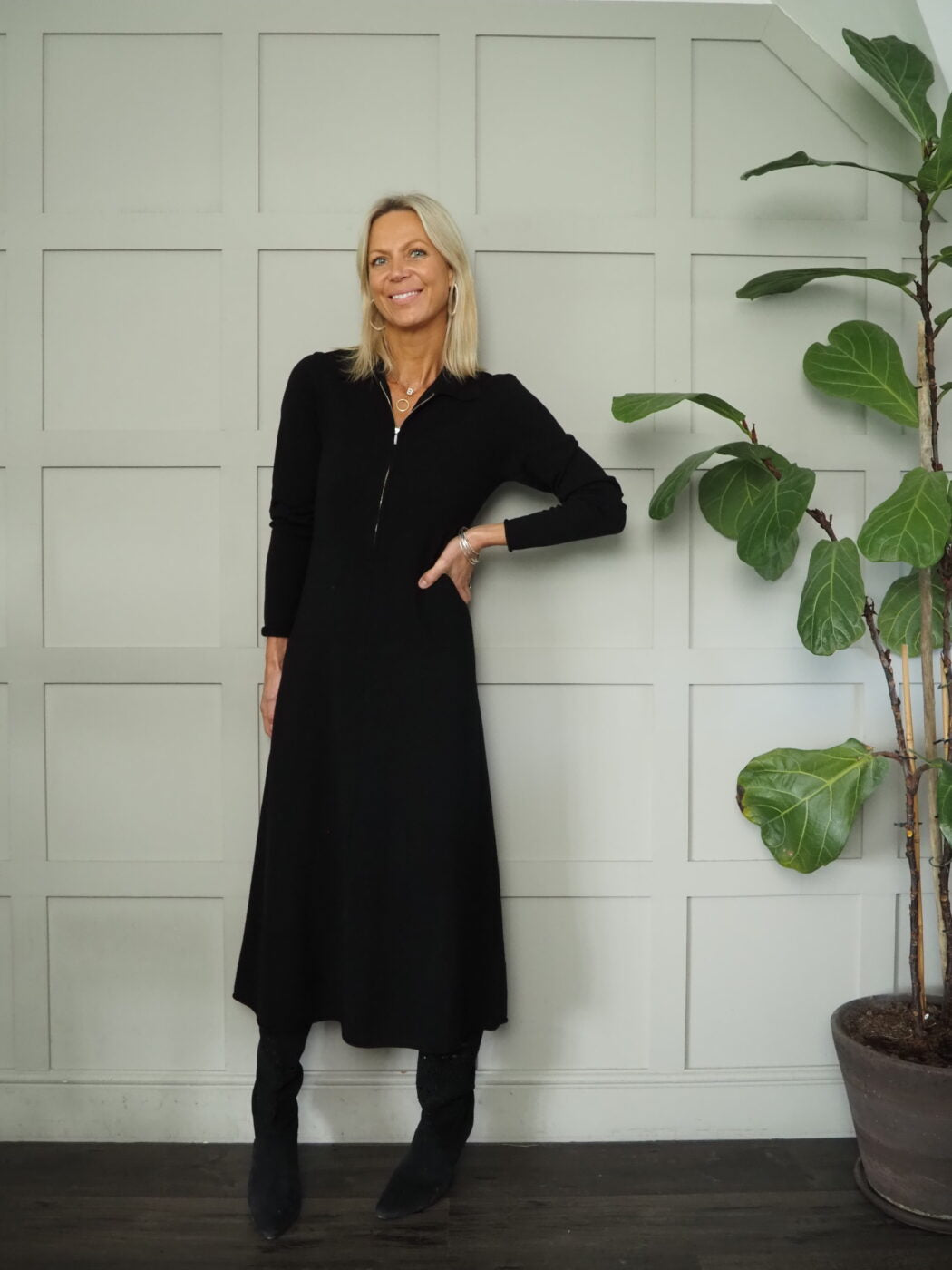 This cashmere blend dress is soft and very comfortable to wear with an extremely flattering silhouette. It has a collar, full length sleeves and a zip which gives it a modern twist. The zip can be worn unzipped or zipped down to give it a V neckline. A fabulous, very classic and elegant piece for the autumn and winter which can be worn casually or dressed up.