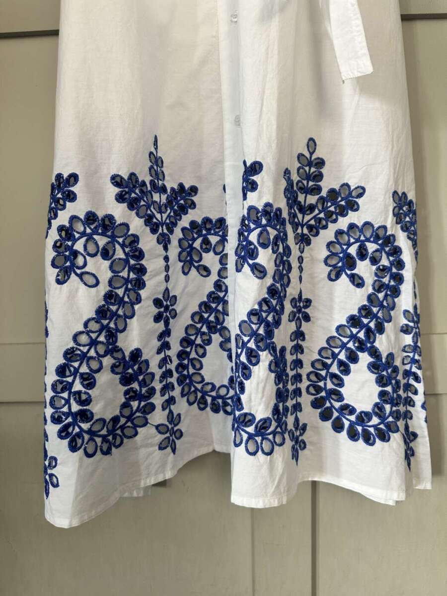 Fabulous shirt dress, with a gorgeous blue broderie anglaise detail on the skirt. Buttoned all the way down with a detachable belt, a collar and long sleeves. The skirt is lined to just above the knee . A very pretty, versatile piece for the summer which can be worn for lots of different occasions.