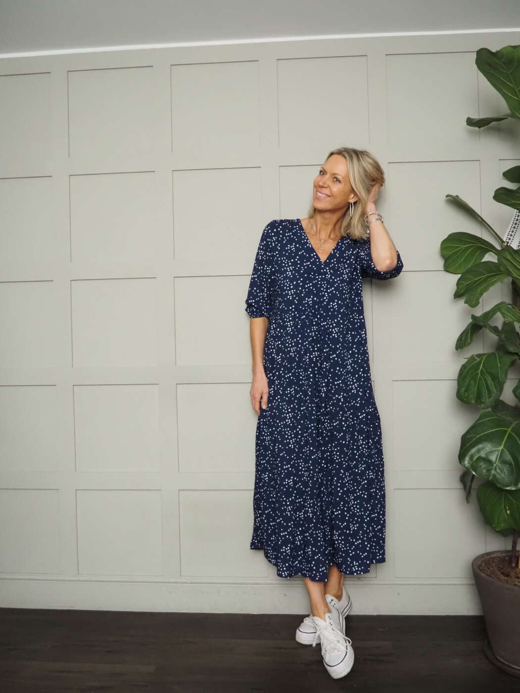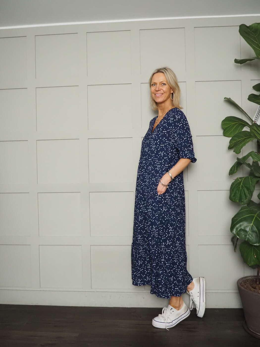 This dress has 3/4 length sleeves with elasticated cuffs. It has a v neck and is tiered and it is super floaty and lightweight.