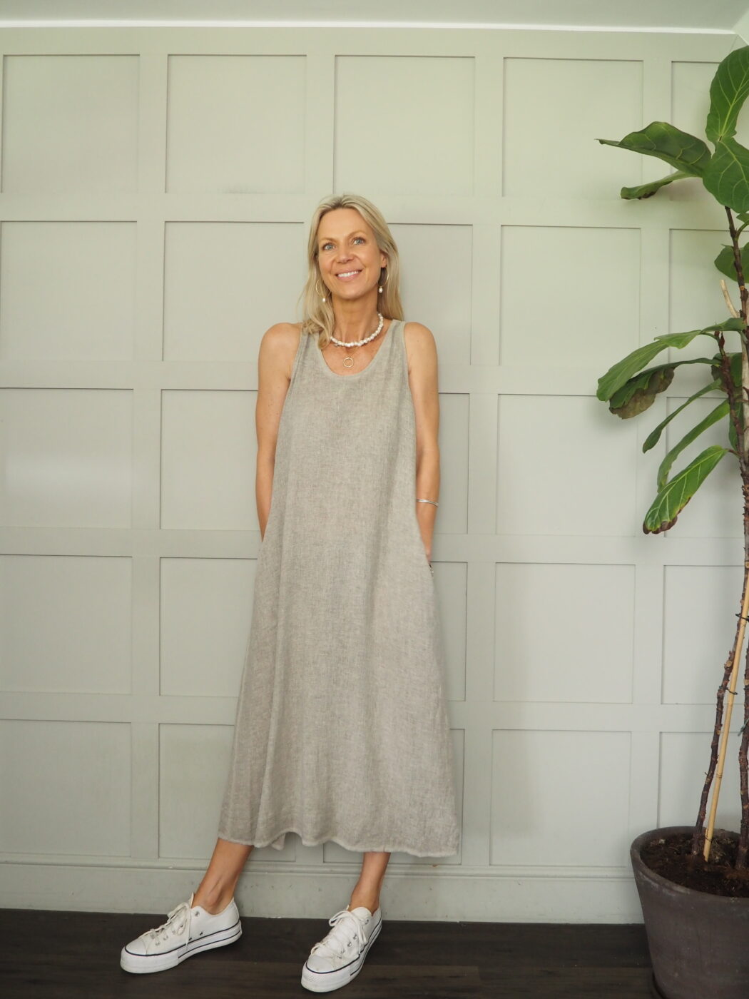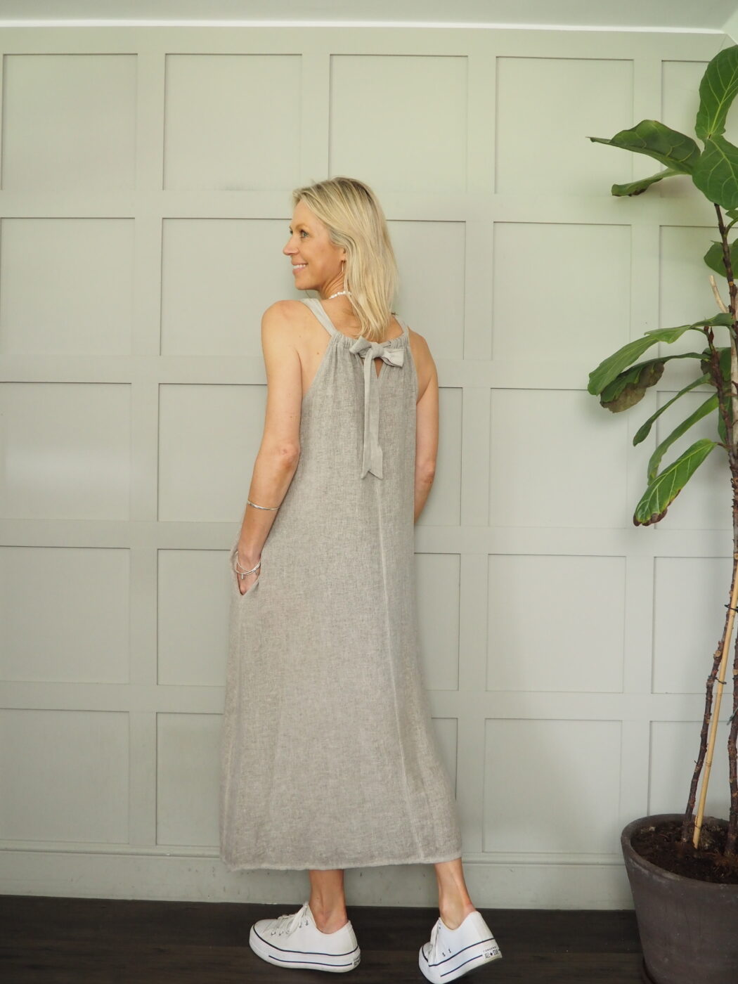 This relaxed fit dress will keep you cool and stylish in the summer months – it has a slightly scooped neck, a tie detail at the back (which can be left loose or tied in a bow) and pockets to the sides. As this dress is midi in length, it will work on a variety of heights.