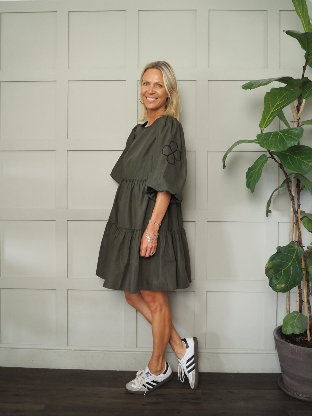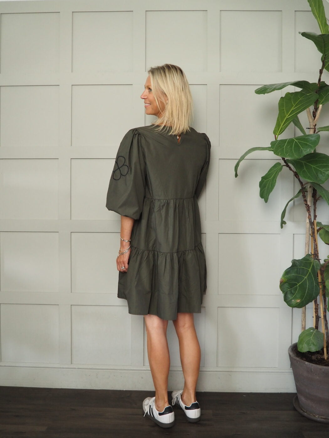 This beautiful dress by the Danish brand, Costa and Mani, would be a fantastic addition to your wardrobe. It features fabulous balloon, elbow length sleeves which are wide but have elasticated cuffs. There is a cute black embroidered 4-leaf clover motif on each sleeve. Round necked and there is a single button at the back of the neck. This dress is tiered and would work on lots of different heights. It can be styled in different ways, worn casually with trainers, dressed up with heels or worn in colder weather with tights and boots.