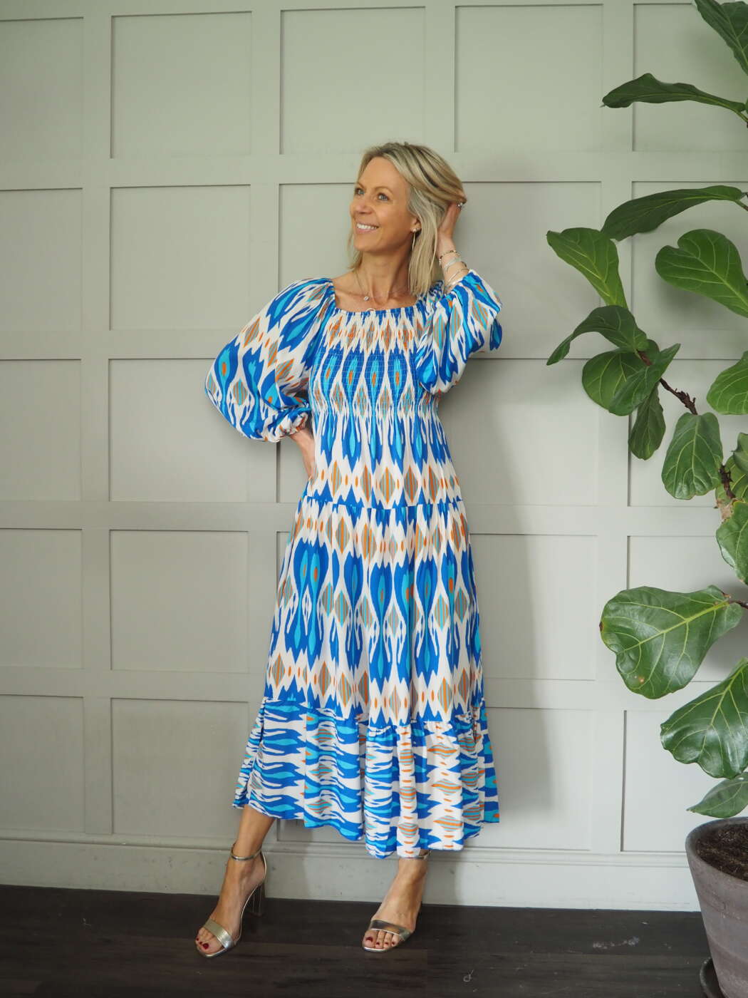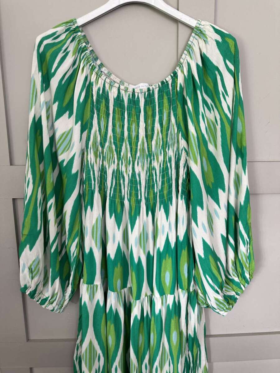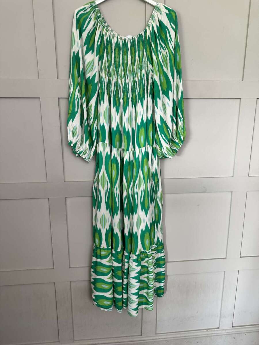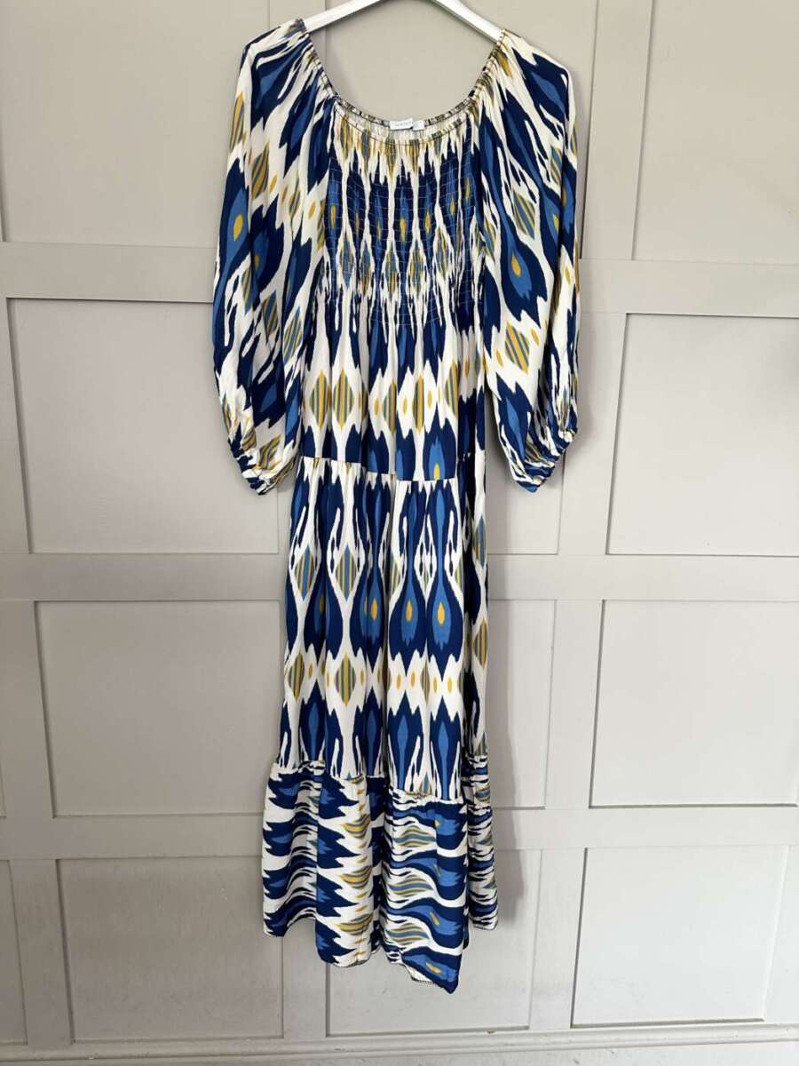 Fab and lightweight maxi dress, this has a beautiful print all over. A lovely addition to your spring/summer wardrobe. Elasticated neckline – which is low at the back as well as the front, elasticated cuffs, long sleeves and a ruched bodice. These can be worn on or off the shoulder.