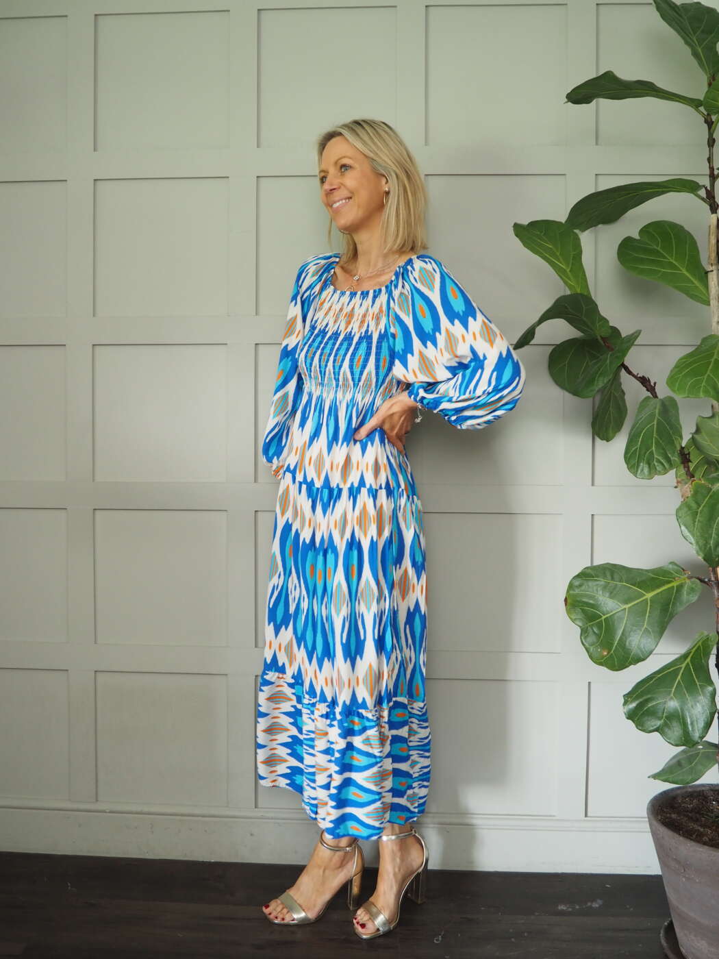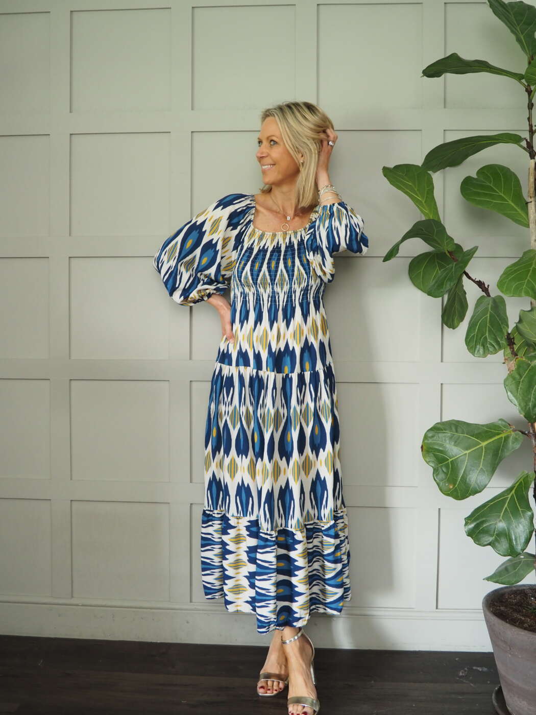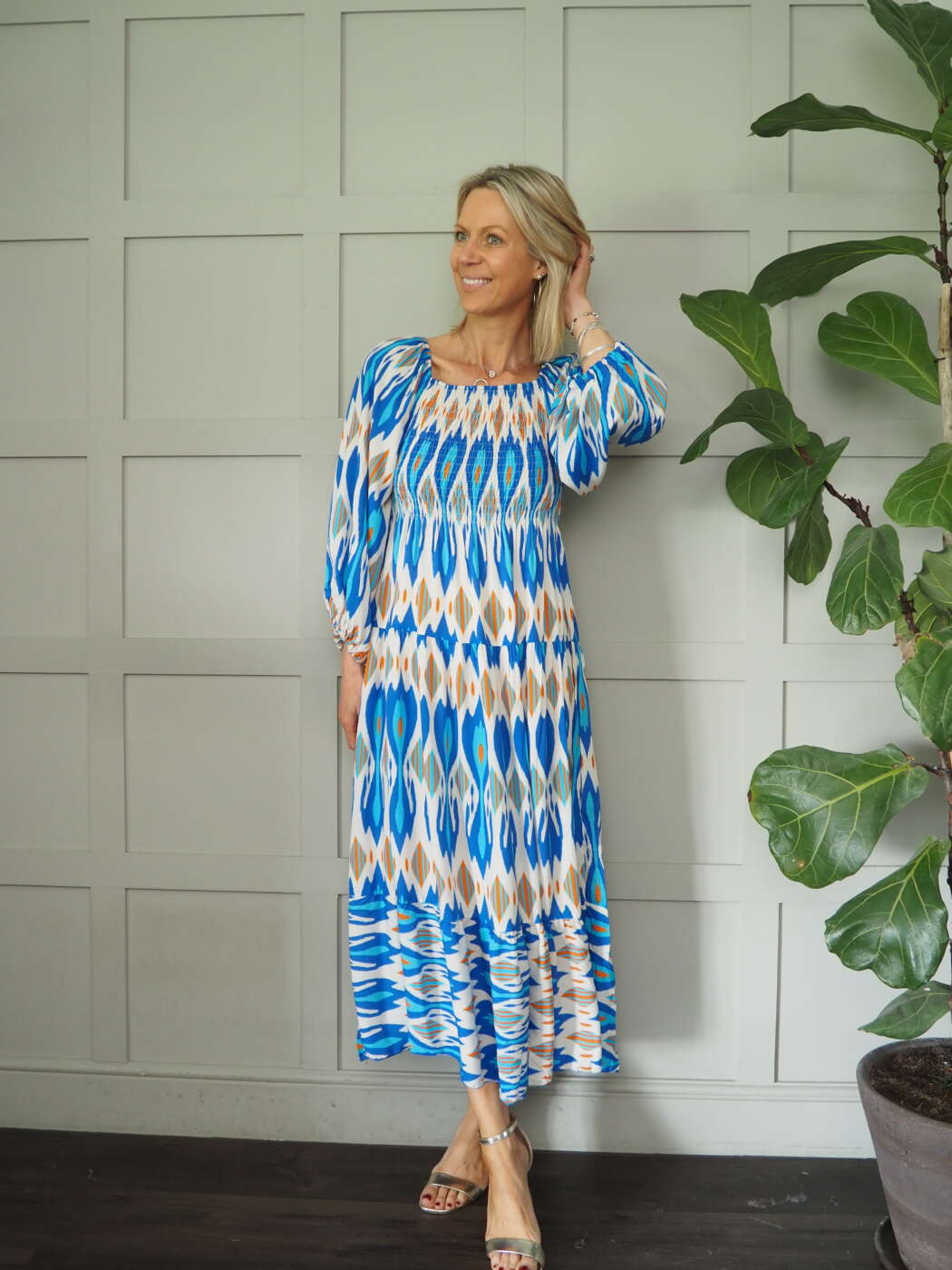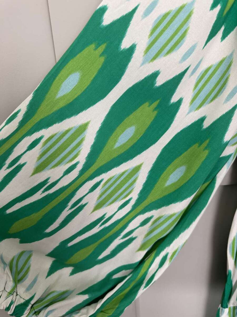 Fab and lightweight maxi dress, this has a beautiful print all over. A lovely addition to your spring/summer wardrobe. Elasticated neckline – which is low at the back as well as the front, elasticated cuffs, long sleeves and a ruched bodice. These can be worn on or off the shoulder.
