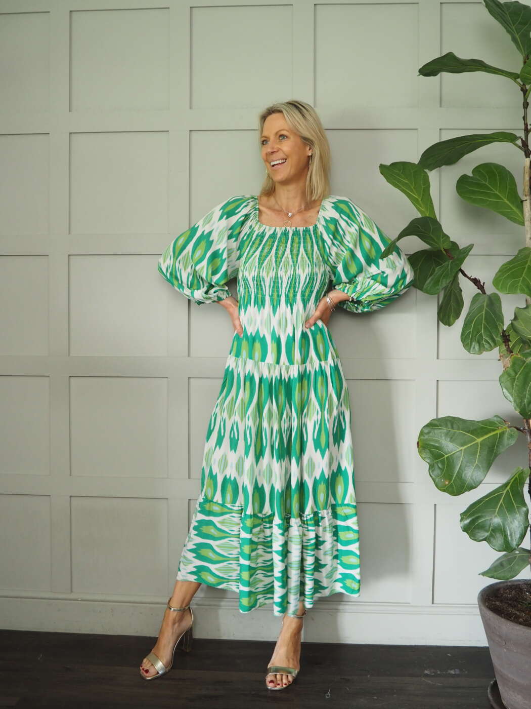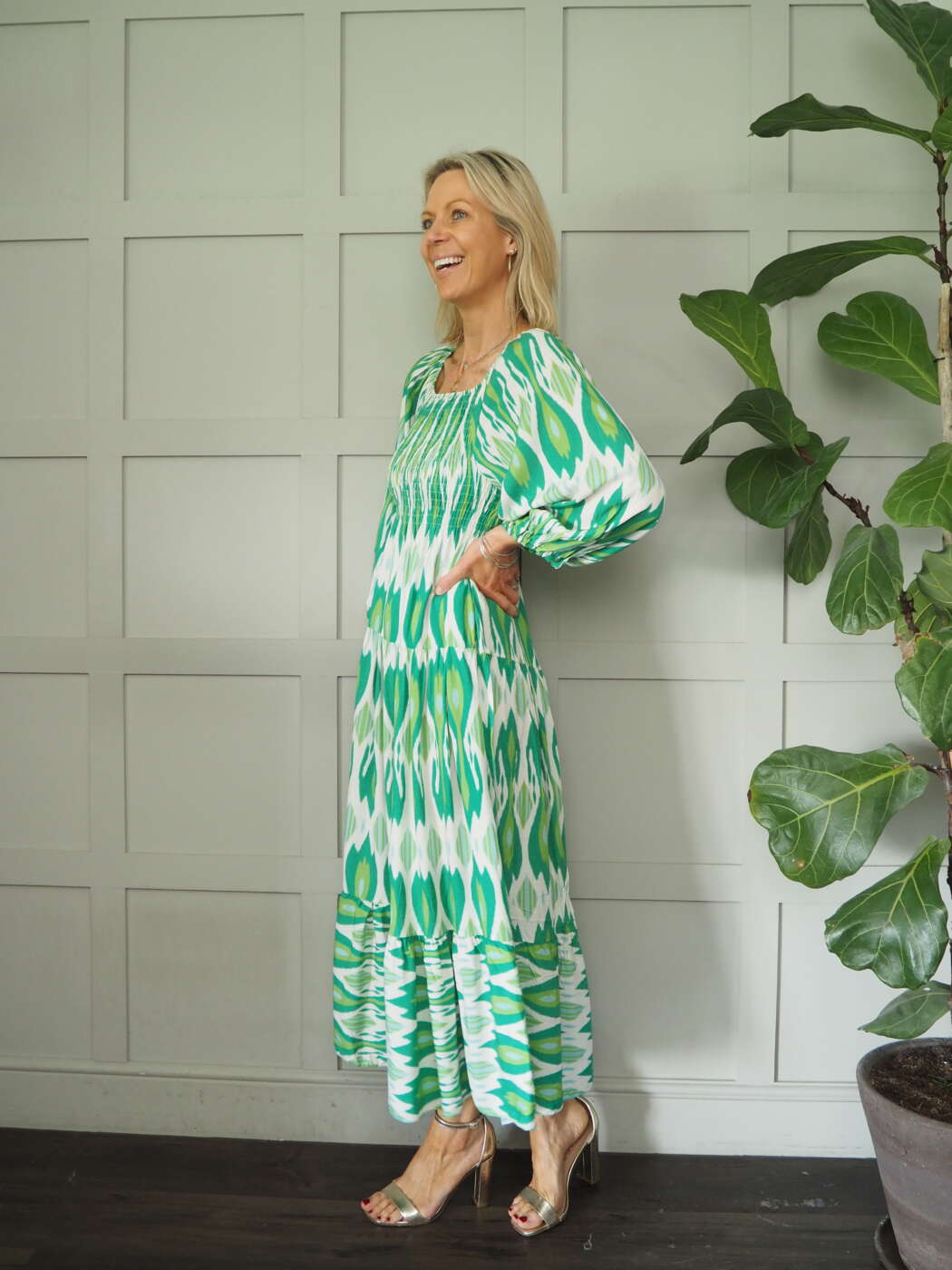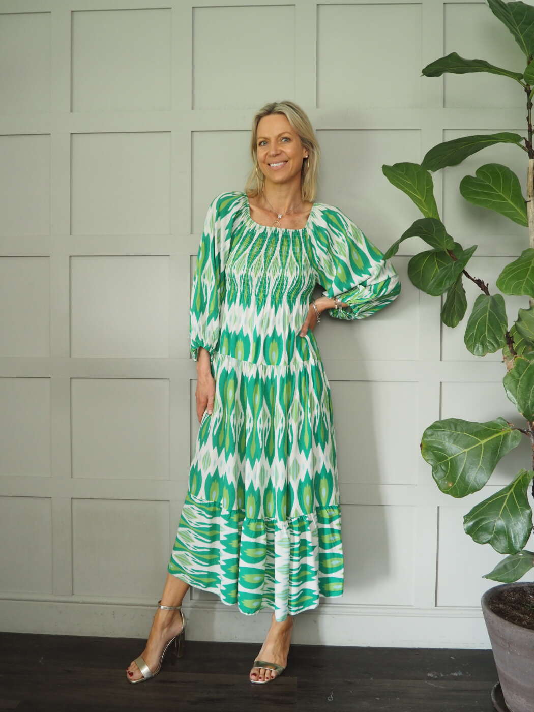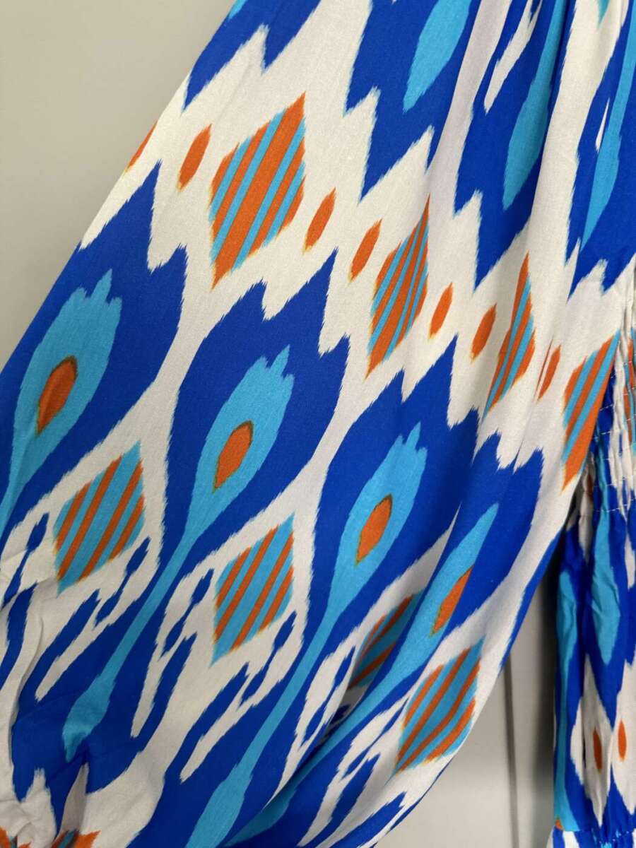 Fab and lightweight maxi dress, this has a beautiful print all over. A lovely addition to your spring/summer wardrobe. Elasticated neckline – which is low at the back as well as the front, elasticated cuffs, long sleeves and a ruched bodice. These can be worn on or off the shoulder.