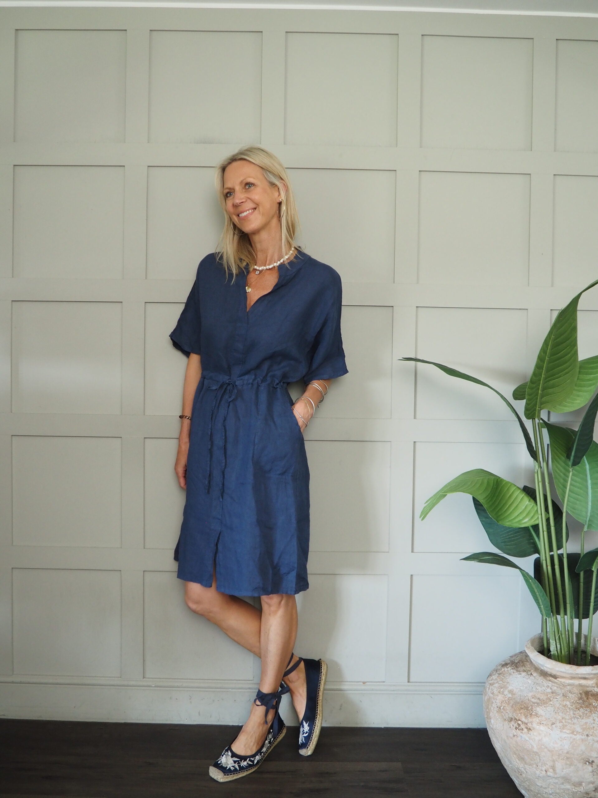 This linen dress is a such a great everyday piece. It will work on a range of sizes and heights. It has a drawstring waist which can be adjusted to suit different sizes and is elasticated at the back to make it extremely comfortable. It has a V neckline, batwing, elbow length sleeves and a split at the front of the skirt. A cool and comfortable piece.