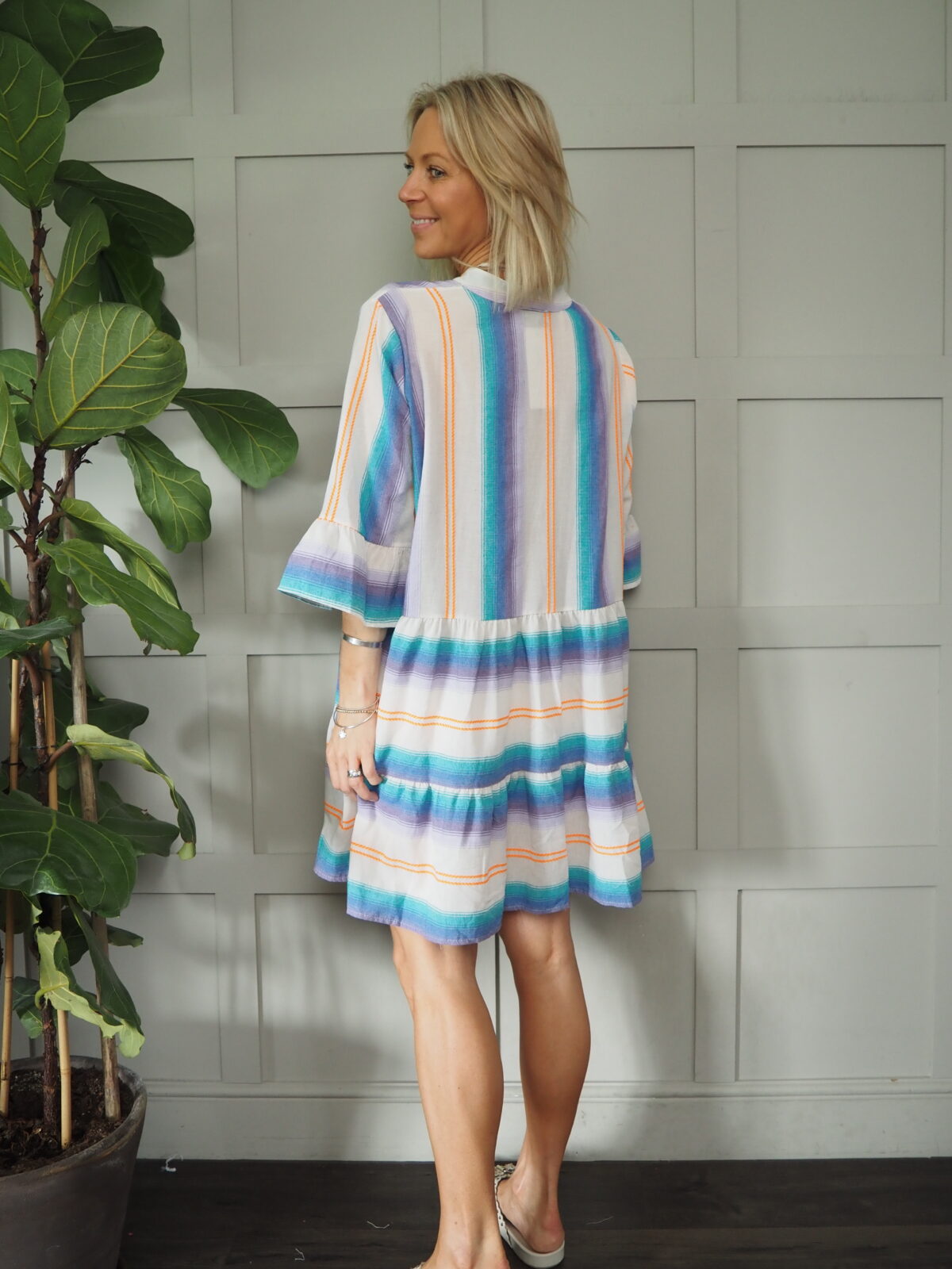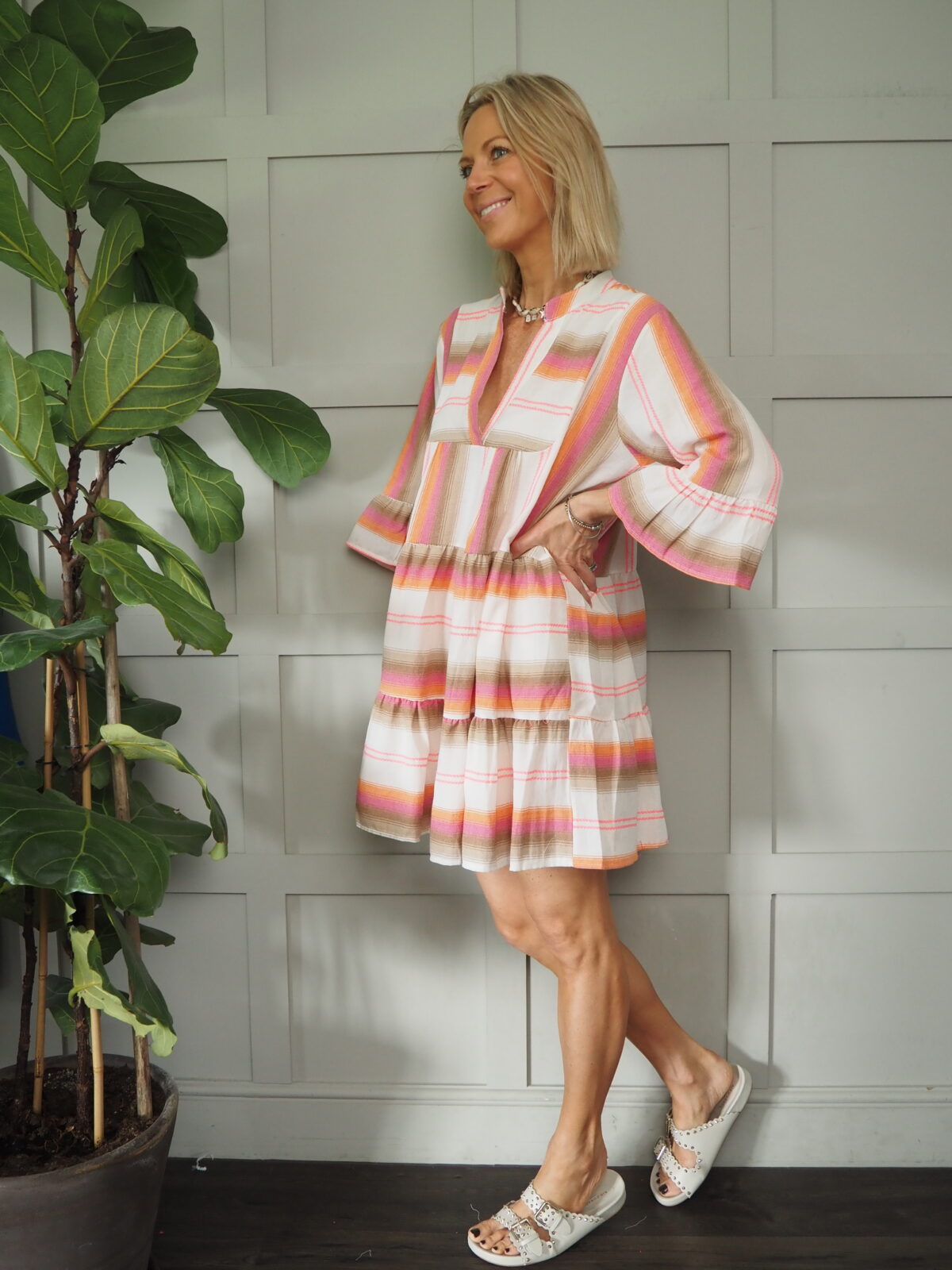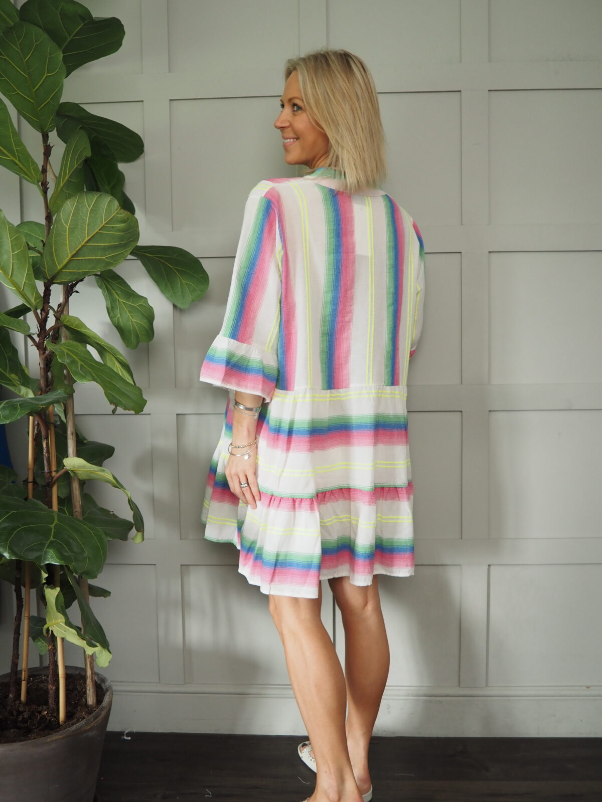 Beautiful striped dress with neon colours. It is knee length with 3/4 length sleeves, this piece is super relaxed and comfy for the hot weather. This dress would work on all different heights.