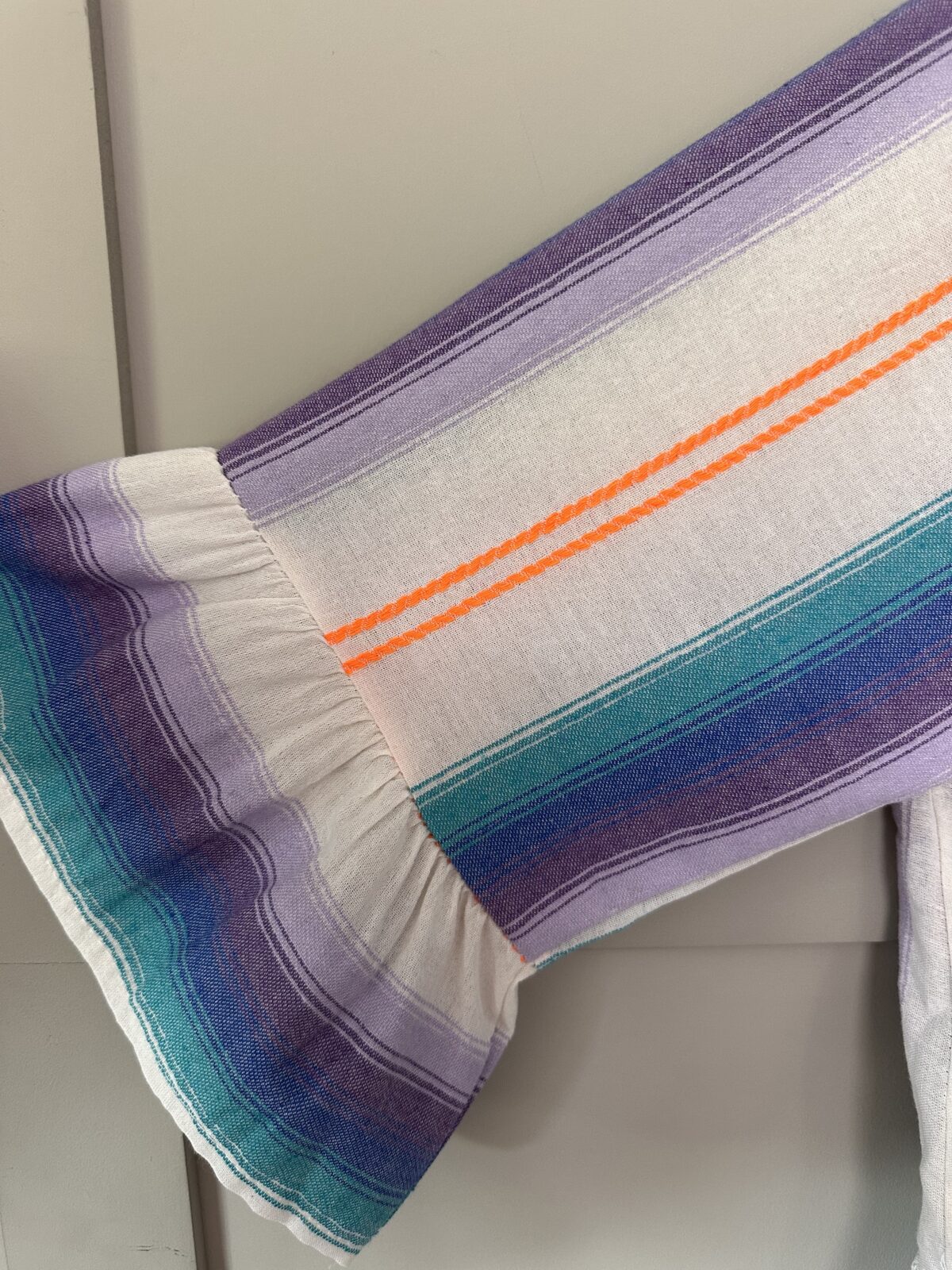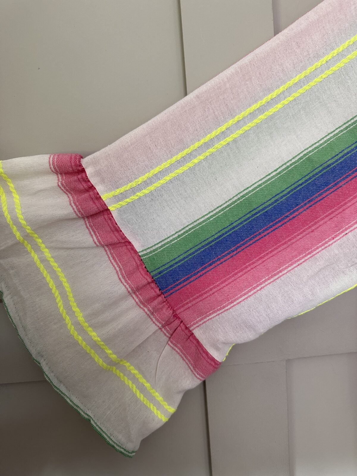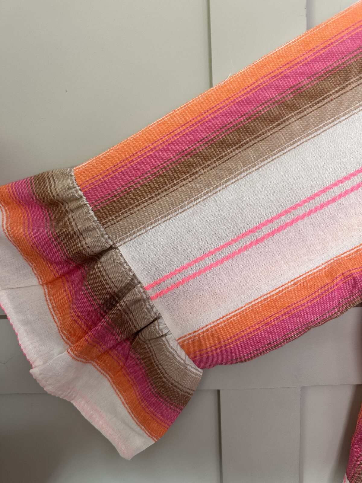 Beautiful striped dress with neon colours. It is knee length with 3/4 length sleeves, this piece is super relaxed and comfy for the hot weather. This dress would work on all different heights.