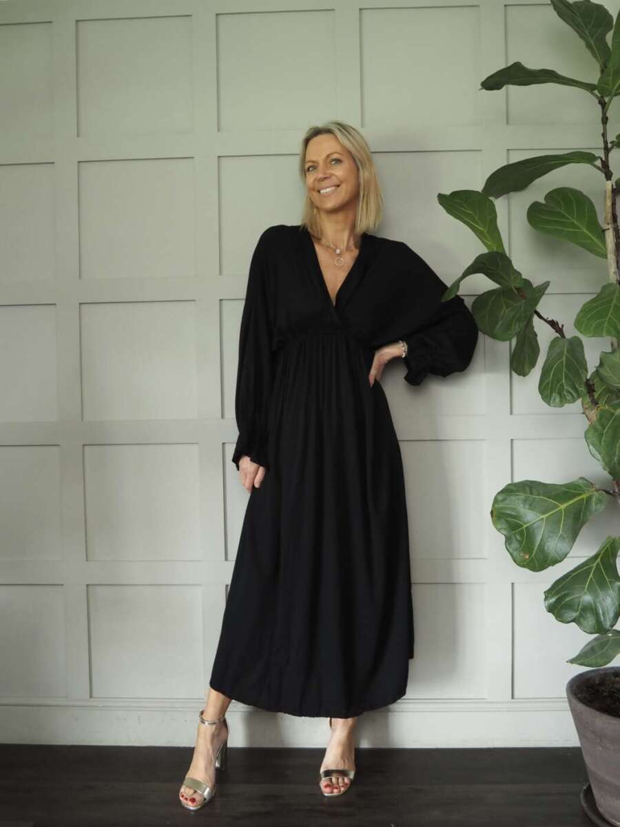 A fantastic maxi dress which is a timeless piece featuring long wide sleeves, a V neck, elasticated waist, cuffs with a little frill and a slit at the bottom on the right hand side.