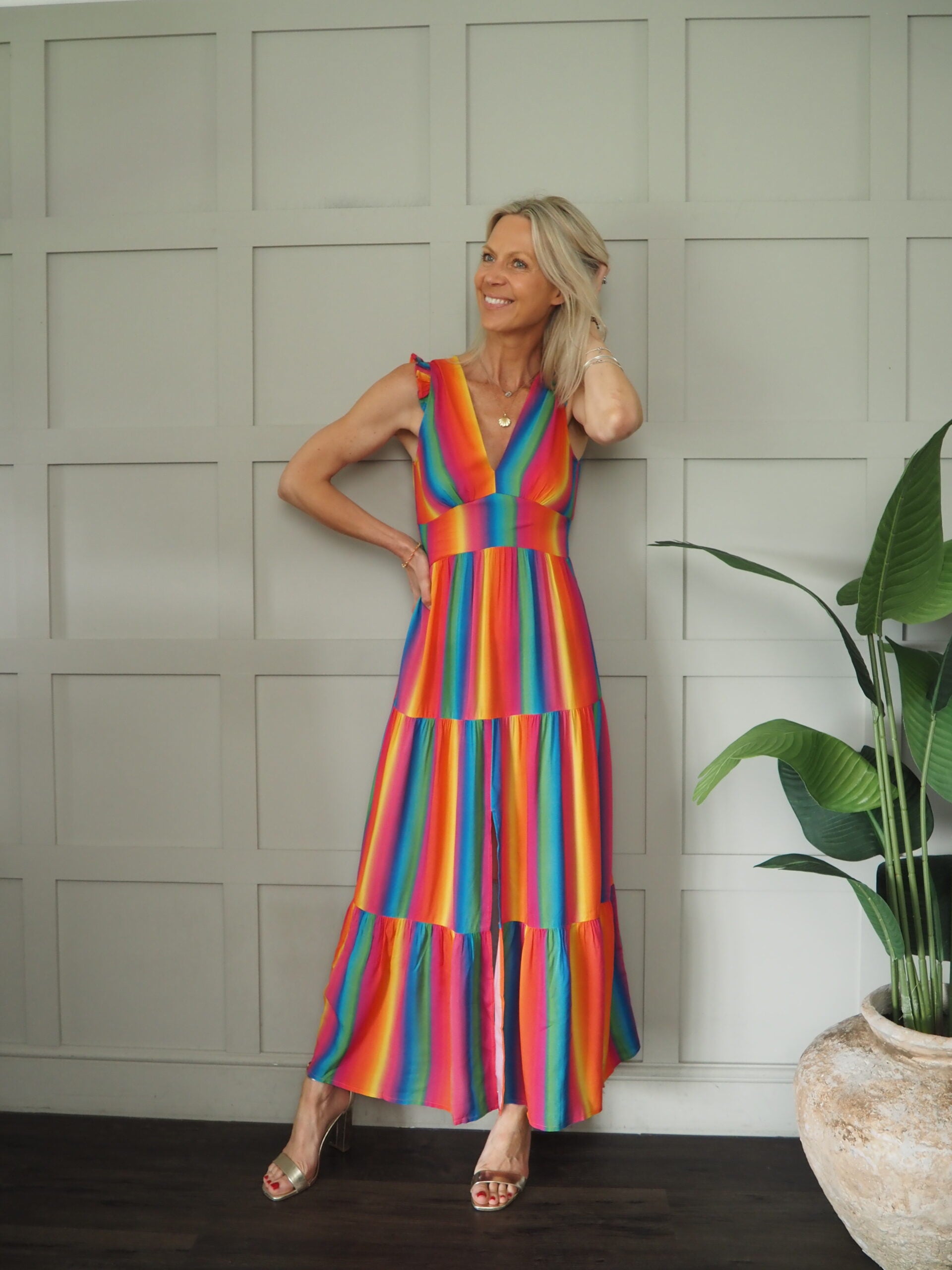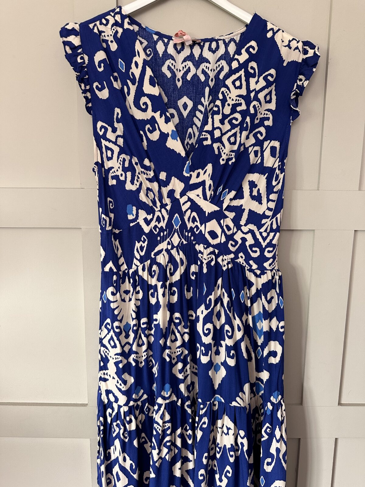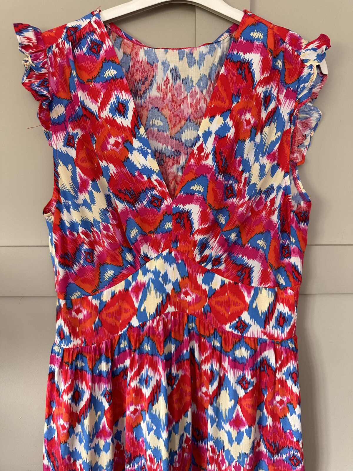 This beautiful dress is simply perfect for the summer. It is lovely and light and can be layered with a denim jacket for cooler summer evenings. Empire line waist with elasticated panel at the back to ensure a good, comfortable fit. Short sleeves with small ruffle on the shoulder, V neckline and tiered skirt.