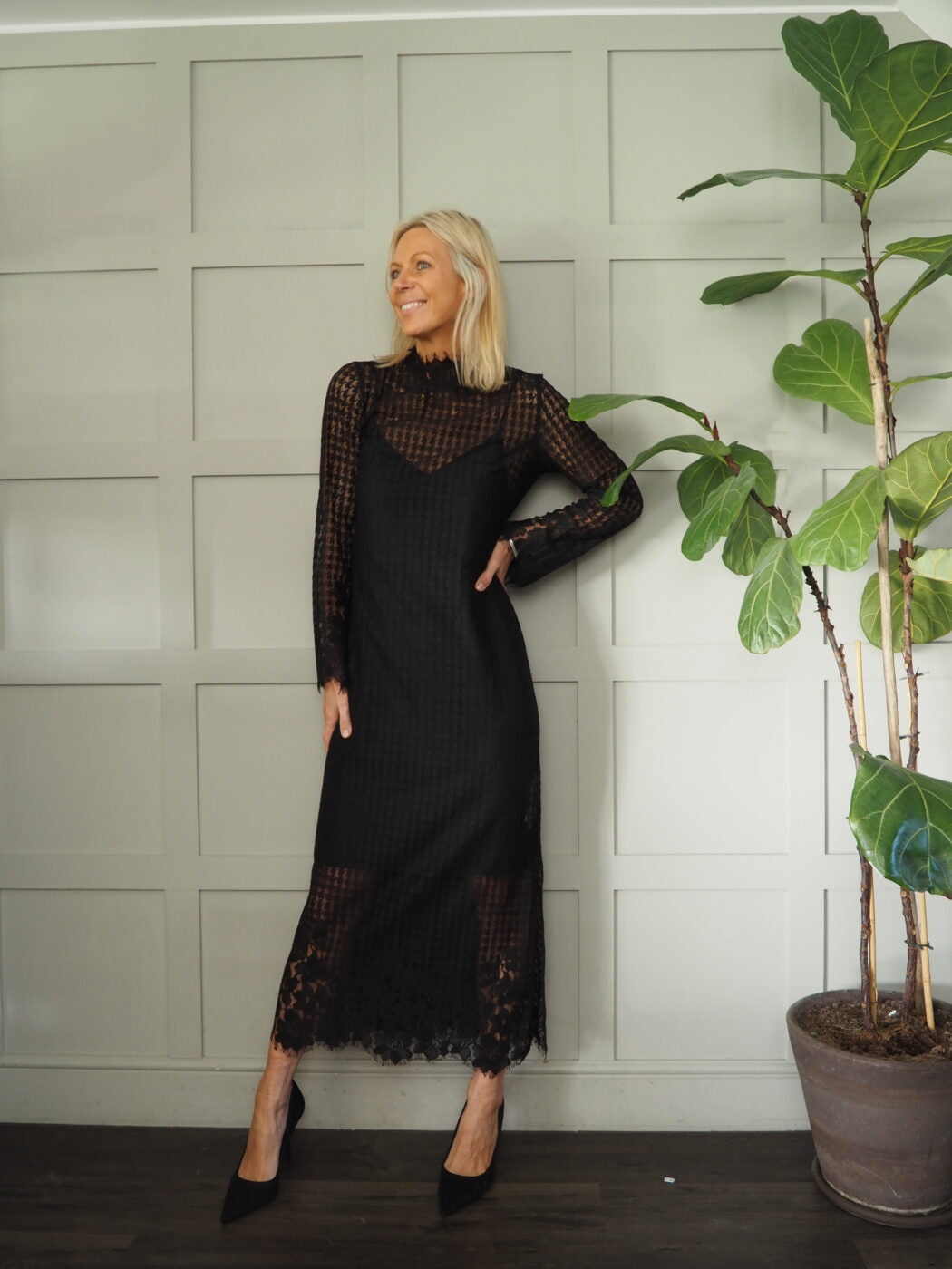 This dress is sensational and a real showstopper. This lace dress comes with a separate black slip. It has a high lace collar with a zip fastening at the back. It has long sleeves with stunning lace cuffs and slits in the cuffs which gives the sleeves a dramatic effect. It also has a slit at the left hand side to just above the knee. Please note there is a label on the seam which needs to be cut out before wearing.