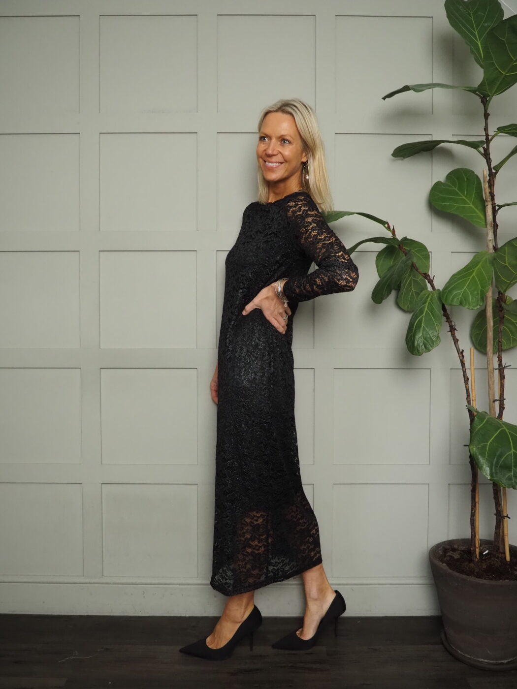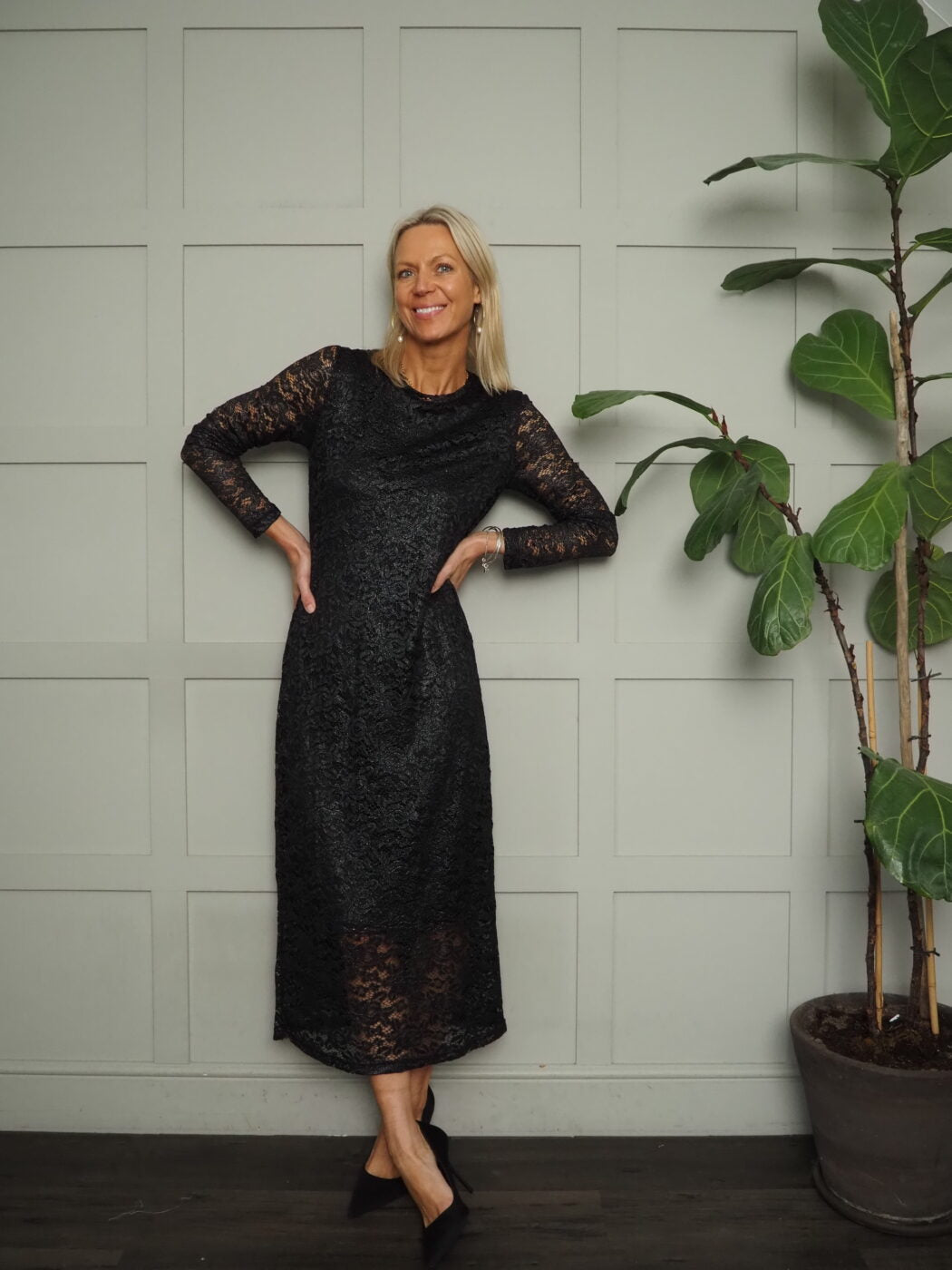This stunning and very flattering lace dress is a real showstopper. A perfect dress for special occasions and parties. The body of the dress is lined to the knee with sheer sleeves and a sheer hem. The lace has a subtle silver Lurex thread running through it to give it a pretty shimmery effect. This dress has such great versatility as can be worn with heels for an elegant evening look or worn with trainers or boots for a more dressed down vibe. This is the dress is similar to the Bysatu blouse.