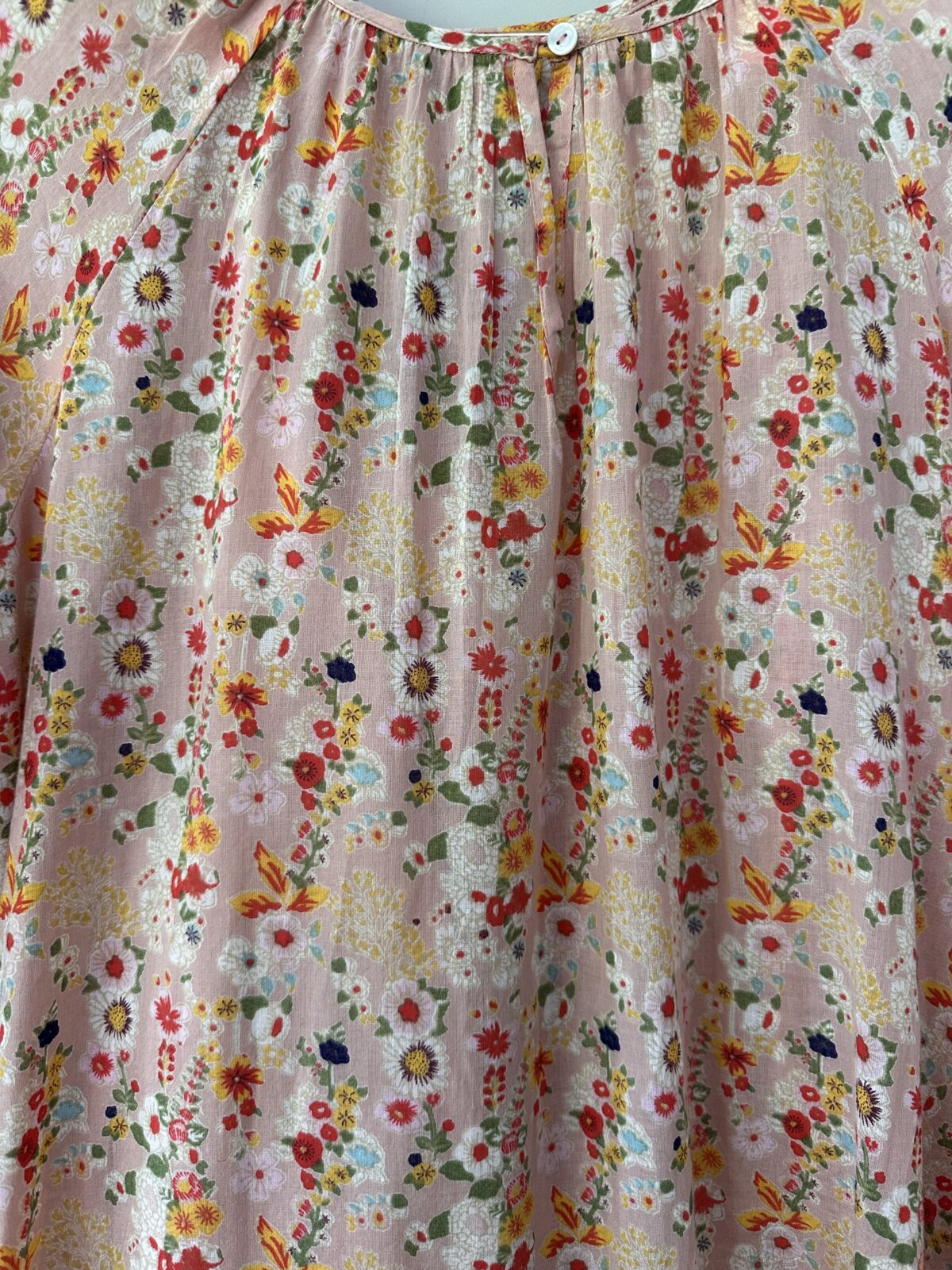 The Orissa is a beautiful pink floral dress with a detachable camisole. Round necked with a button, long sleeves with a single button on each cuff. This dress is perfect for so many summer occasions. It can be worn dressed up with heels or worn more casually with sandals. It’s a great length and will work on a number or different heights as can be worn as a midi or a maxi.