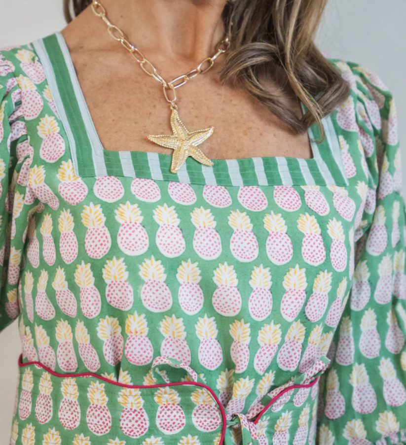 Bright, bold and effortlessly stylish, this dress is designed with a flattering square neckline, that can be worn both on the shoulders and off- Bardot style. The flowing skirt silhouette is perfect for keeping you cool and comfortable as well as the three-quarter puff sleeves. The vibrant green has printed pink pineapples all over, adding a fun tropical twist to your wardrobe. There are pockets and a matching, detachable belt.