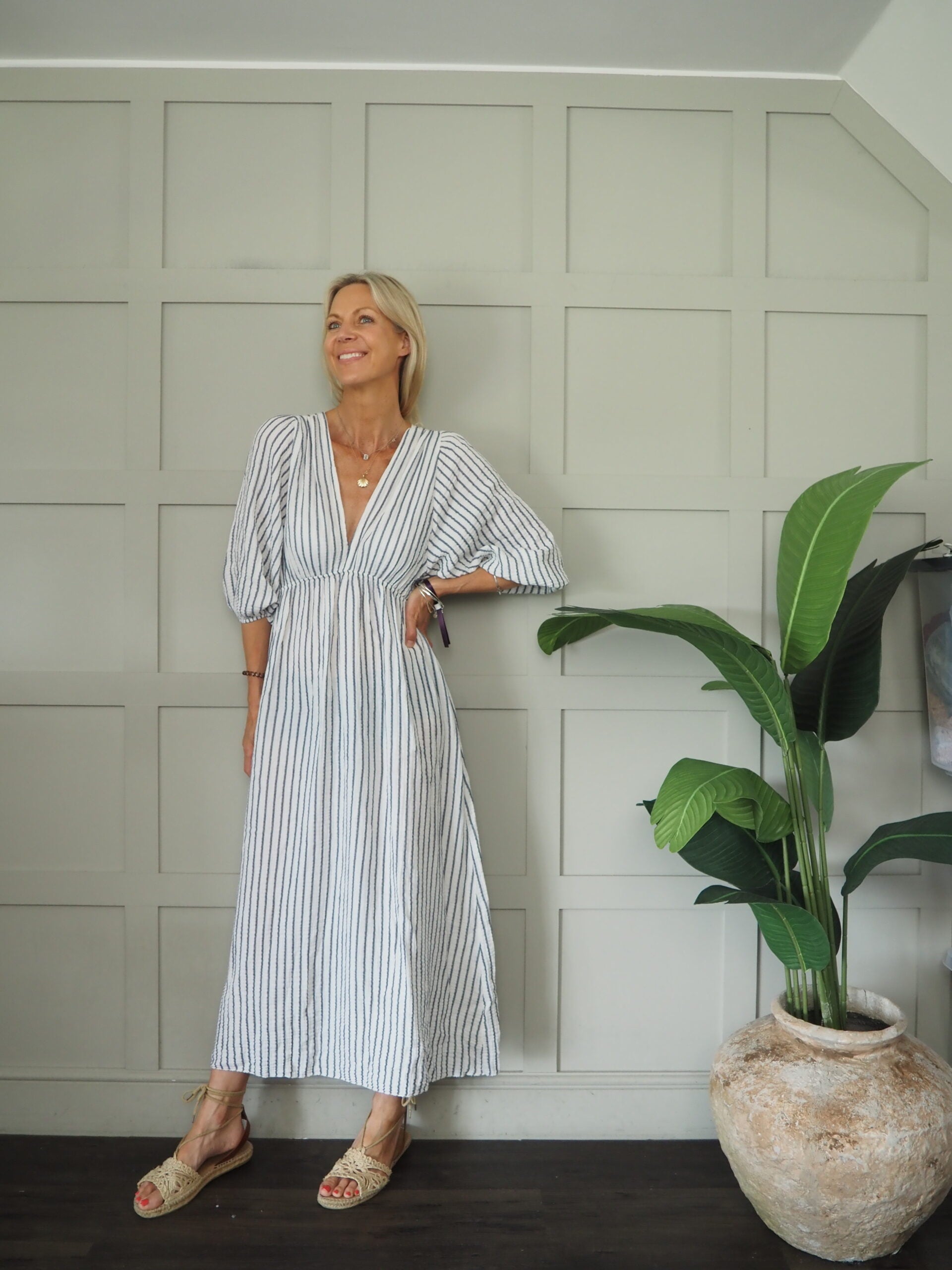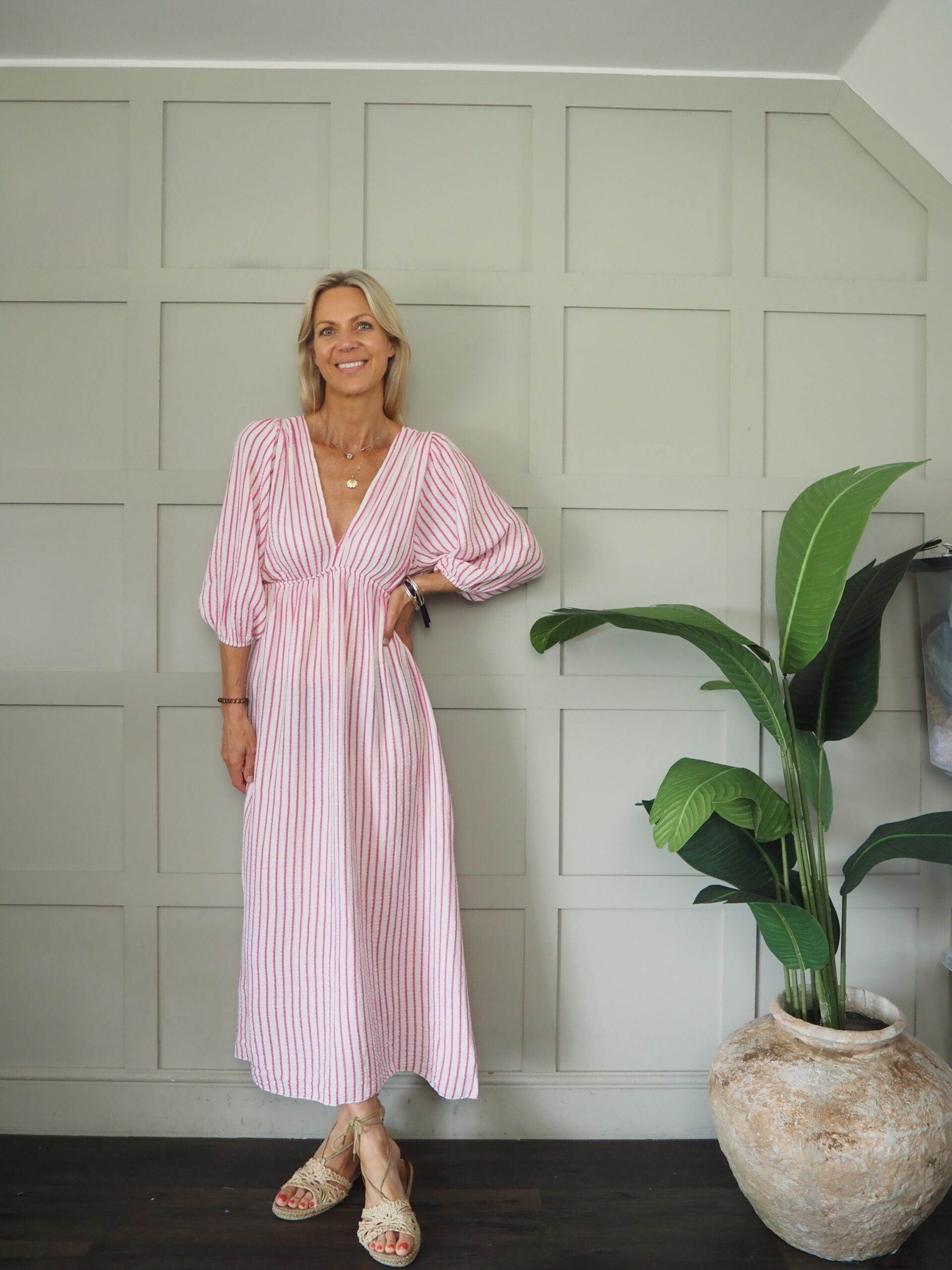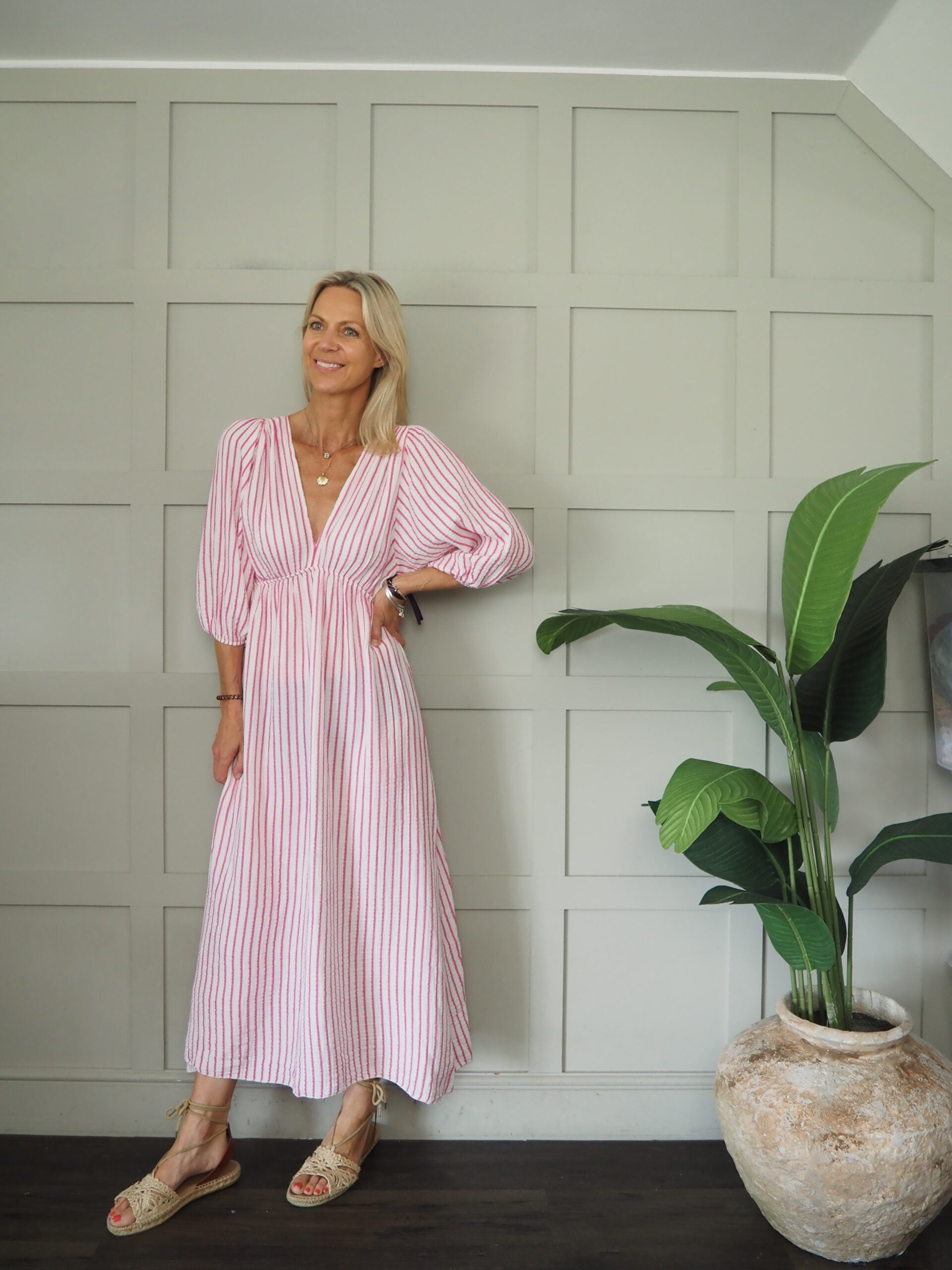 The Pippin striped cheesecloth dress, has cropped, balloon sleeves with elasticated cuffs, a v neck at the front and a v neck with a tie detail at the back which can be tied tighter or loser to suit your size. The waistline is elasticated making it very comfortable. A fun, cool and easy to wear piece for the summer.