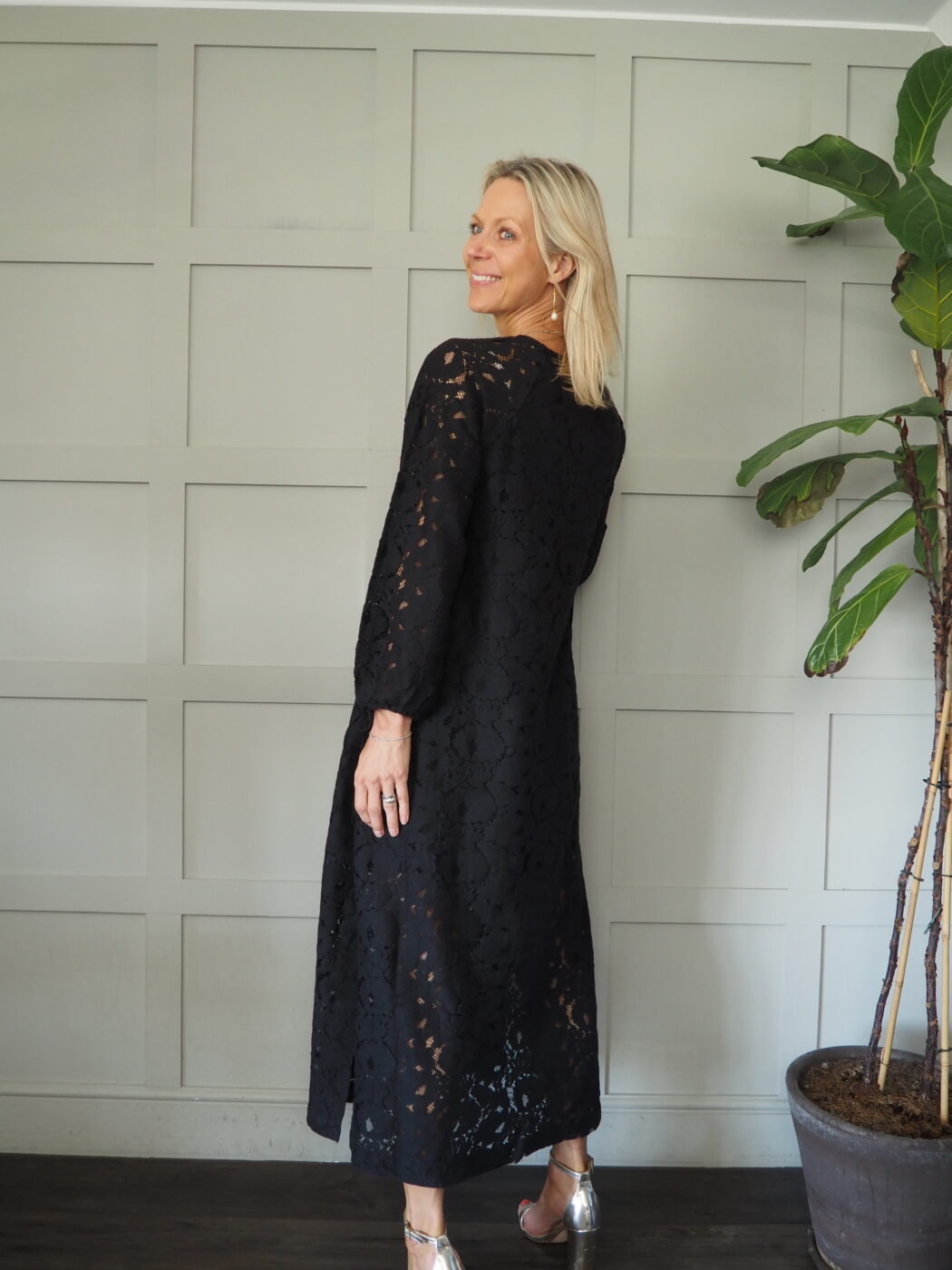 This stunning lined lace dress can be worn for so many occasions. It’s perfect to pack in your suitcase for a holiday, great worn for an evening out or can be worn with some flat sandals more casually during the day. The body of the dress is lined to mid thigh. The full length sleeves are sheer with tie fastenings on the cuffs. There is a slit on either side of the skirt.