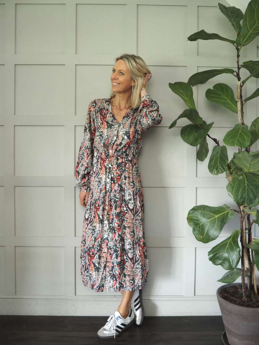 Long sleeved, maxi dress, buttons all the way down the front. Drawstring that can be left loose or tightened to cinch in your waist. Single button on the cuffs.