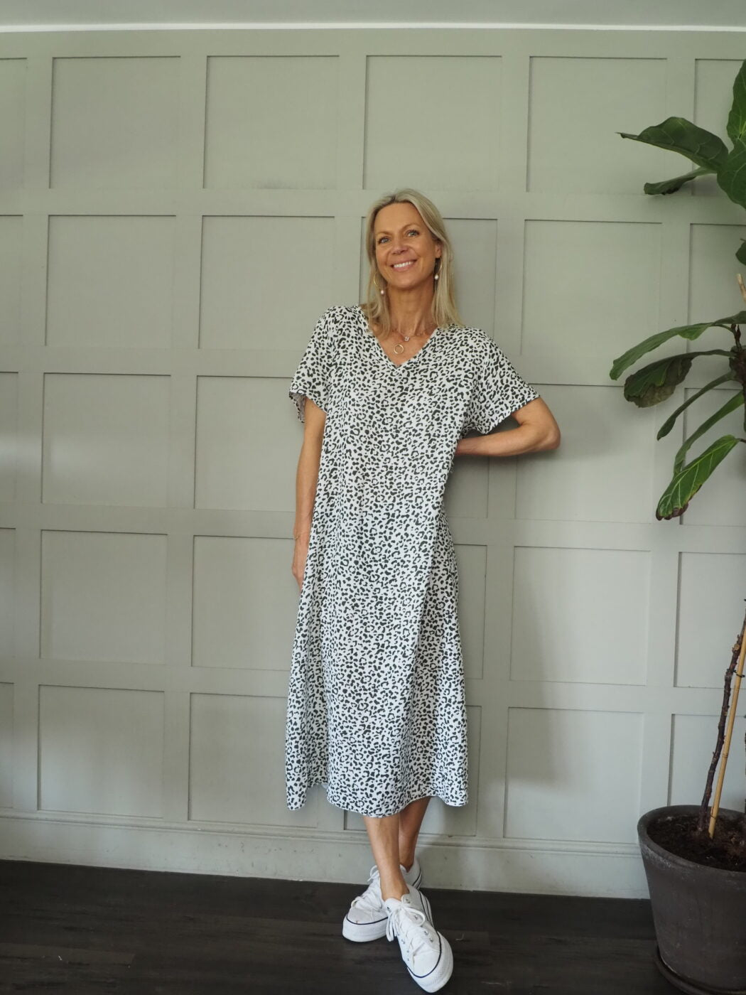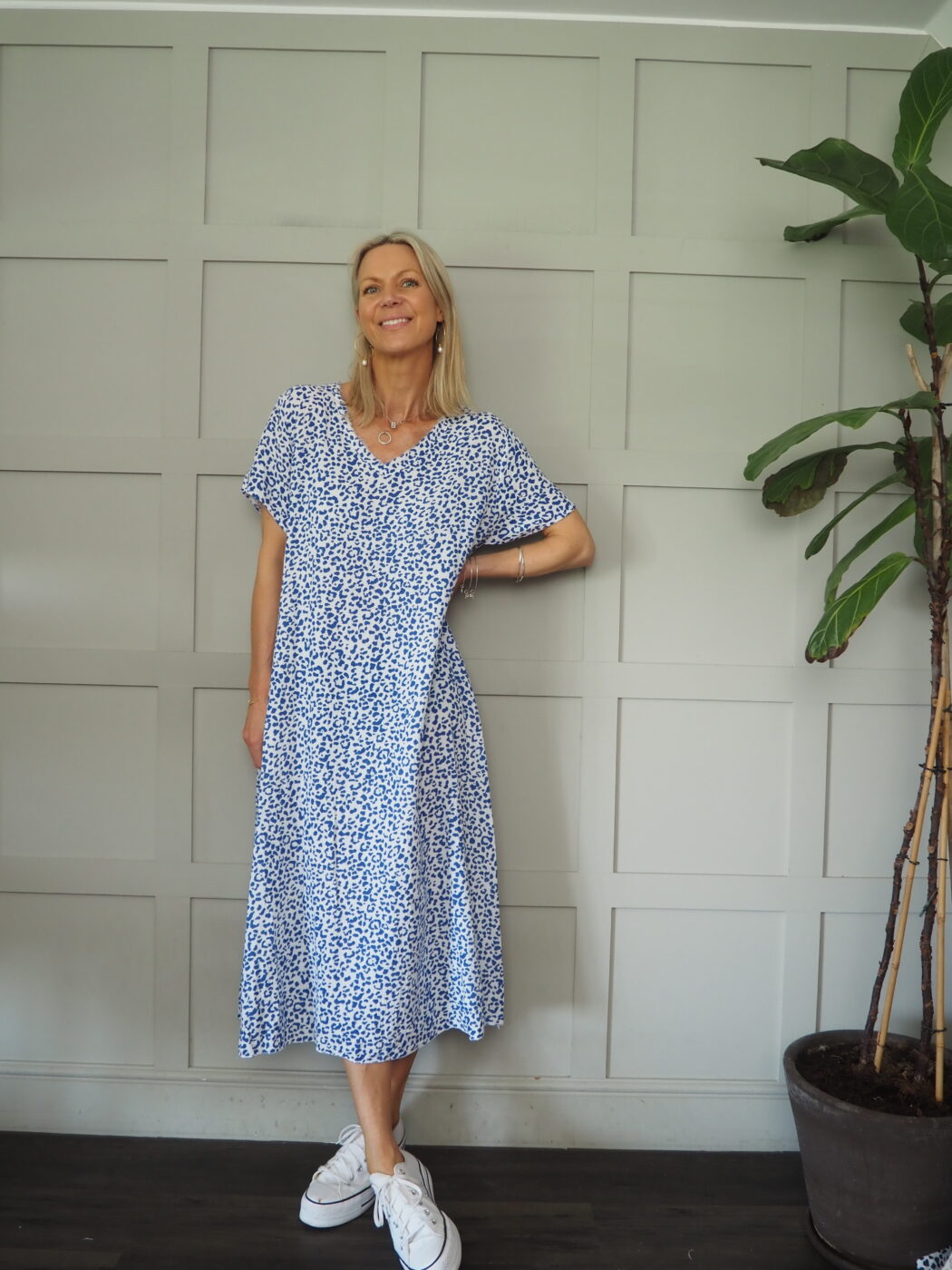 This leopard print, cheesecloth dress is cool and comfortable and perfect for the spring and summer. It’s a great piece to take on holiday but works beautifully here too and can be teamed with trainers, sandals or wedges. It has a v neckline with raw edges and short sleeves and is a loose fit so will work one a range of sizes and heights. This dress looks great belted too with our Dali Suede Belt – 11 Colours or Teeli Wraparound Leather Belt – 12 Colours