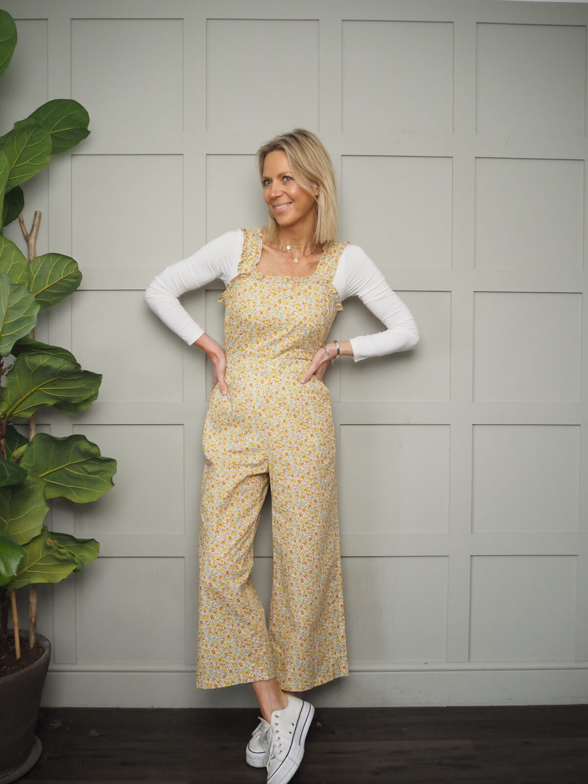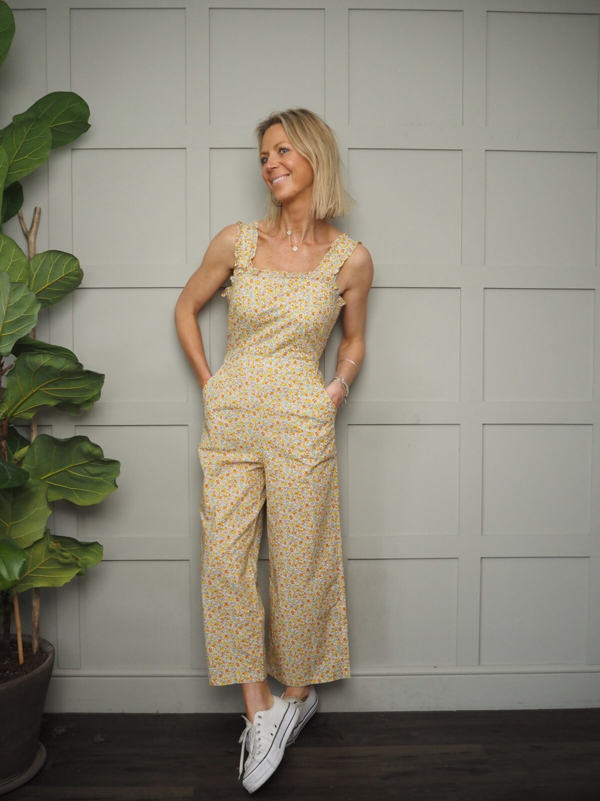 These wide legged cotton dungarees feature an open back with a pretty tie and an all over yellow based floral pattern. Square neck, frilly detail on the wide straps and the neckline. Elasticated waist at the back and pockets to the side.