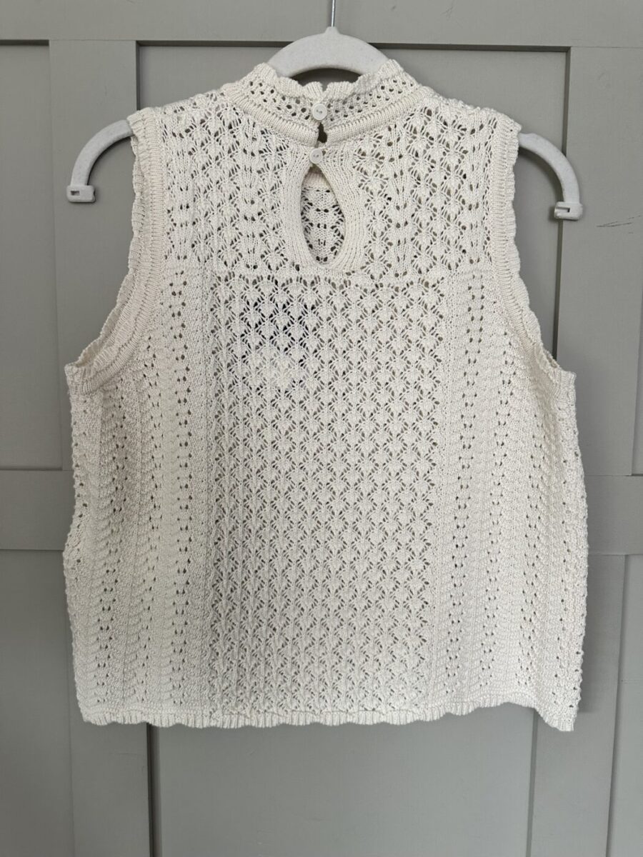 This tank is so pretty! Beautifully detailed, this is crocheted with a high frilly collar and two buttons fastening at the back. Can be worn layered or on its own.