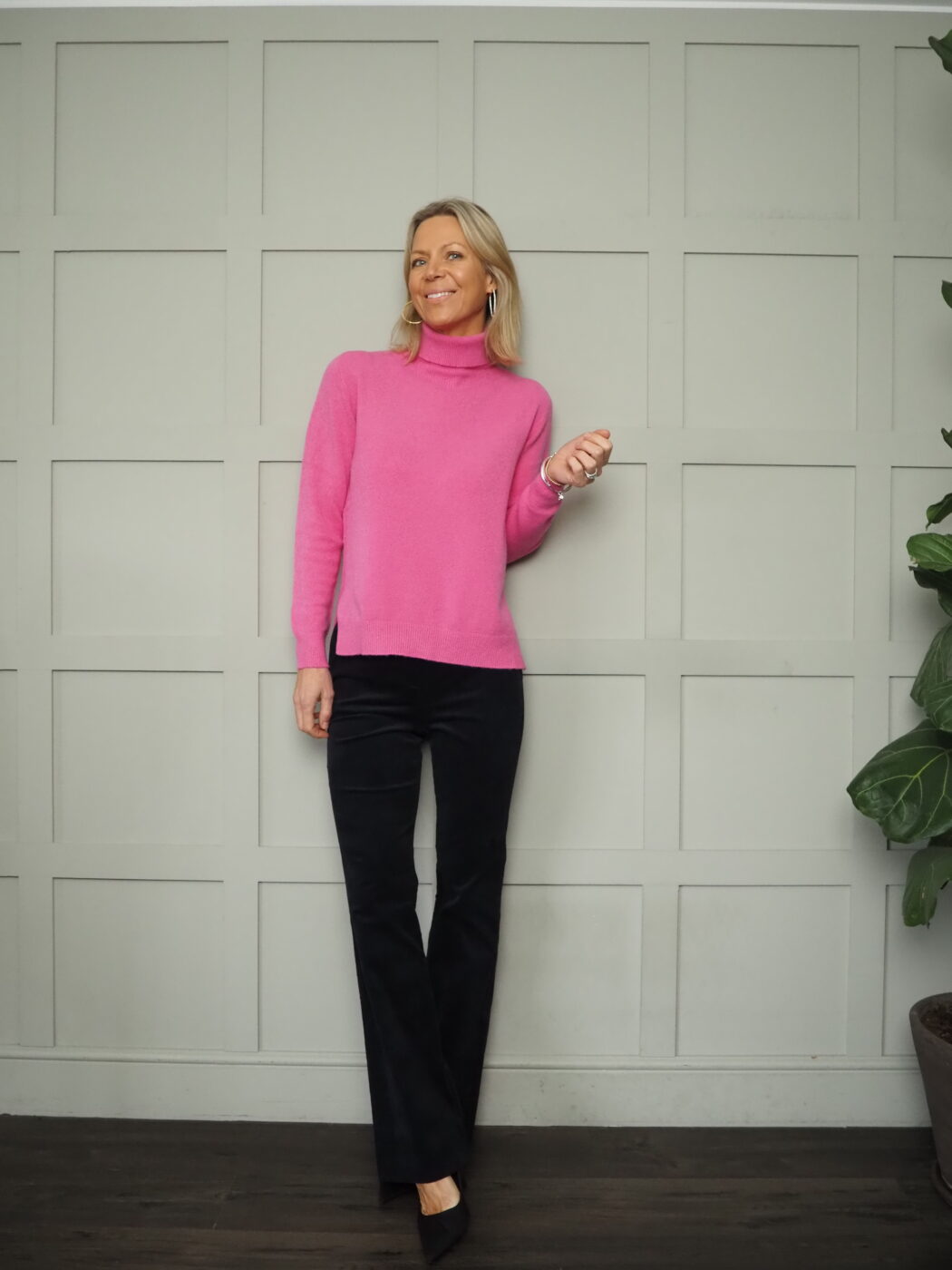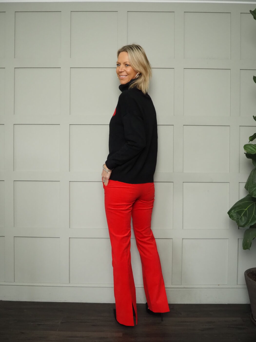 Worn here with the Rach Polo Neck with red heart – 3 Colours also with the Happy Polo Neck and the Navy Blue Canzone Double-Breasted, Lined Blazer with Front Buttons, Single Cuff Button and Faux Pockets by Emme – Navy Blue.