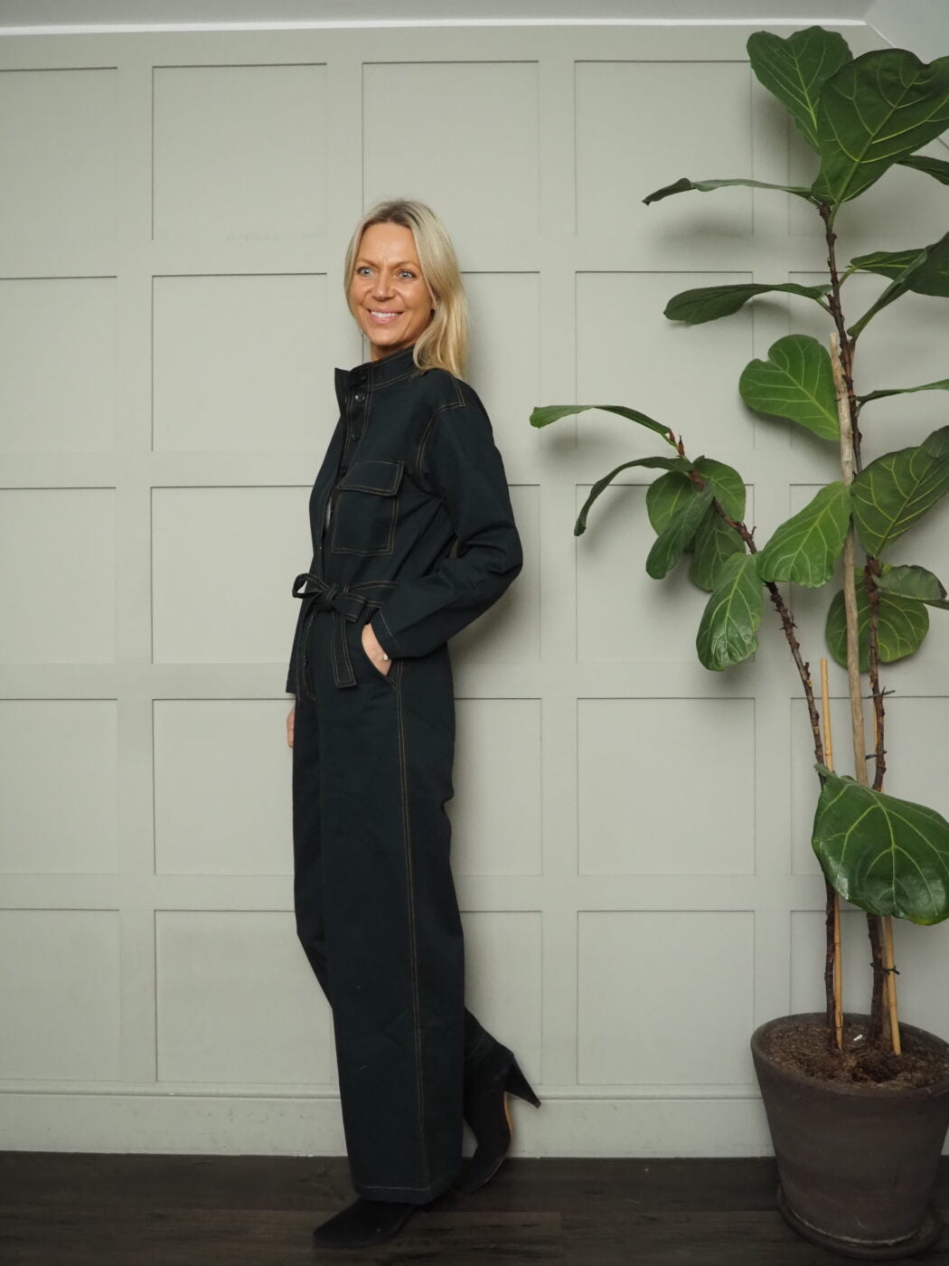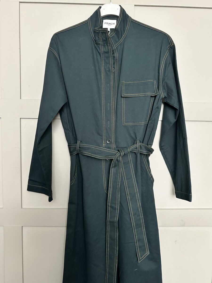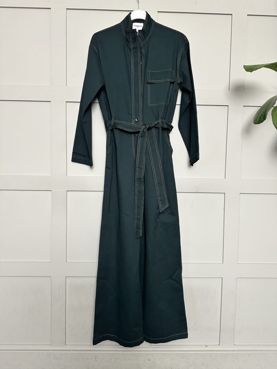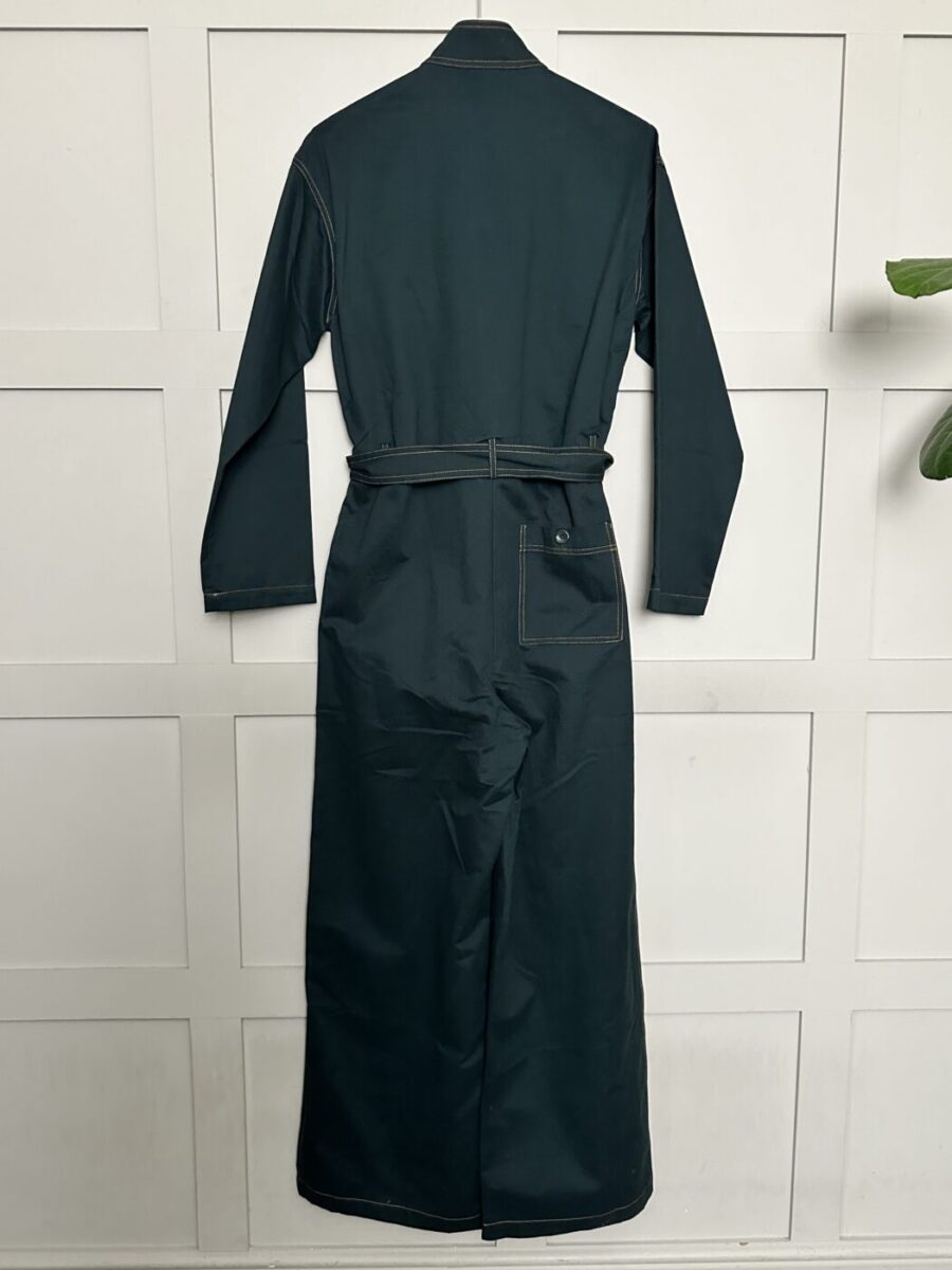 This jumpsuit is modern and stylish in a rich, deep forest green colour, it has a round collar, button fastenings, pocket over the left chest, detachable belt, wide legs and long sleeves. Pocket to the rear and at the sides. This can be worn cropped or full length so will work on a range of heights and works with shoes, trainers or boots. A versatile, very comfortable piece which can be worn for lots of different occasions. Great layered with a blouse or fine knit underneath too.