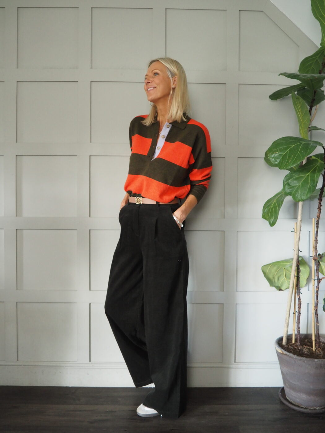 Fine knit and beautifully soft, the Akiko jumper has a collar, 4 front buttons and thick stripes in Khaki and Orange. Lovely worn tucked in or untucked.