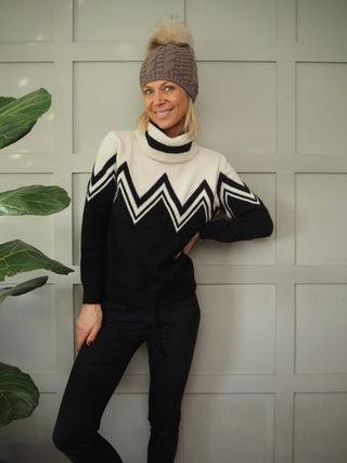 Andrea Pom Pom Hat - Black with Camel Stripe