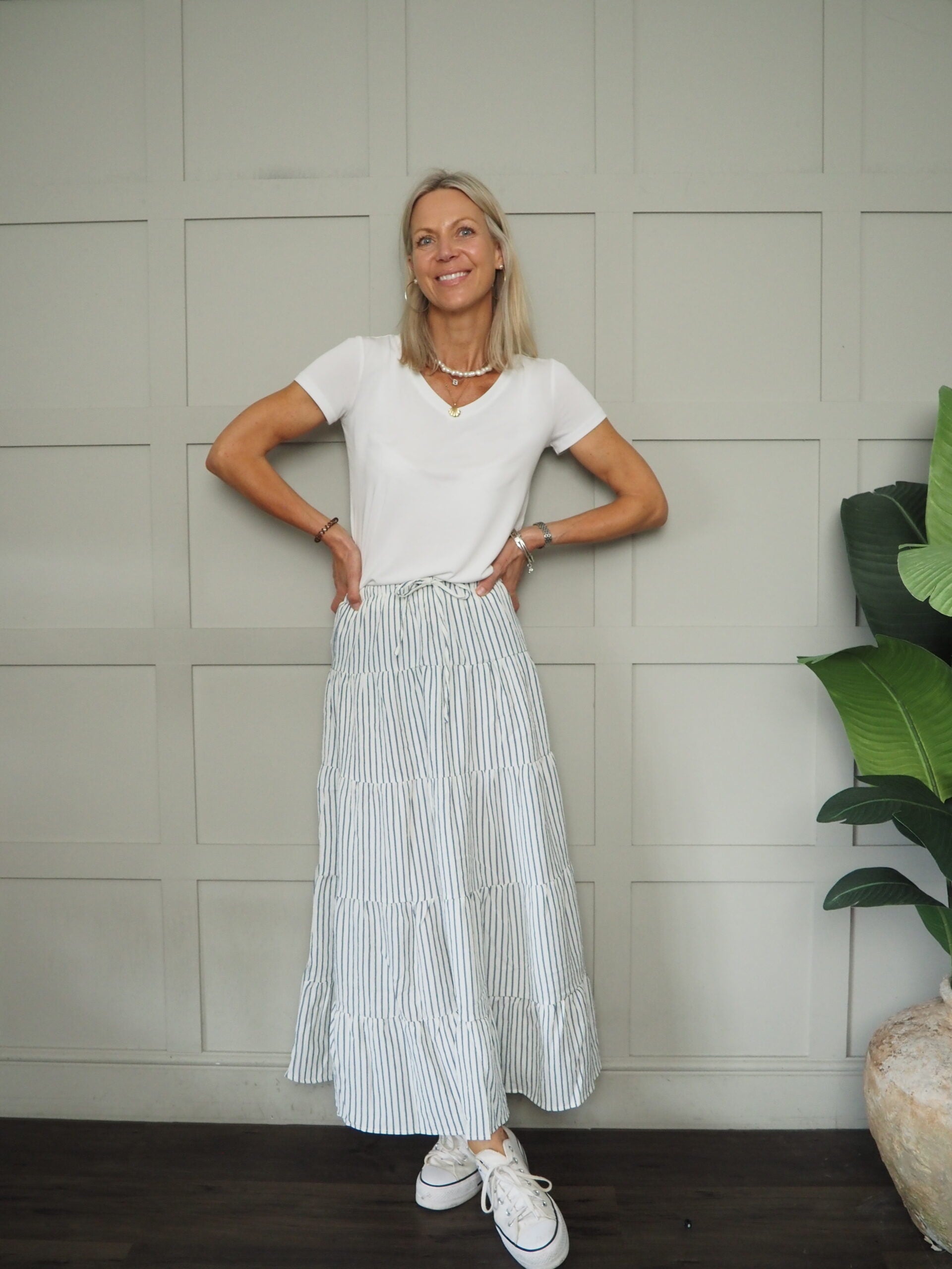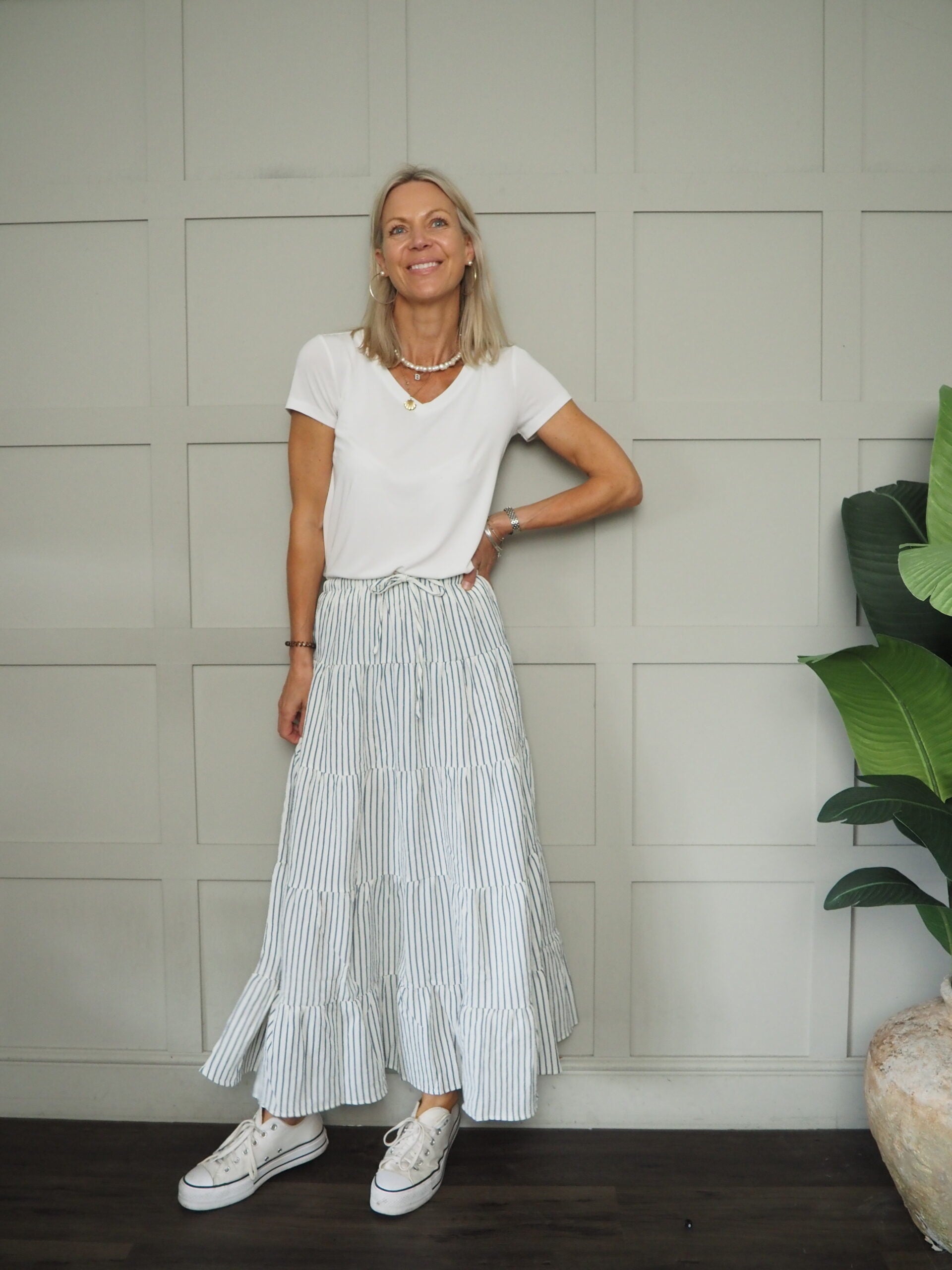 The Burnham skirt is a cool, comfortable and versatile addition to your wardrobe. It has a stretchy, elasticated waistband with a drawstring tie. It can be paired with a vest, T shirt, blouse or knit and can be styled with lots of different footwear to suit different occasions.