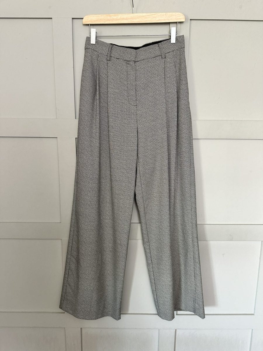 These high waist, wide leg, tailored trousers are the perfect piece to update your wardrobe. They come in a black/off white mini houndstooth fabric with pockets to the sides and faux pockets to the rear. They are pleated at the front with belts loops, a hook and eye fastening and zip fly. The Clark trousers are extremely versatile as can be dressed down with trainers or worn for smarter occasions with heels.